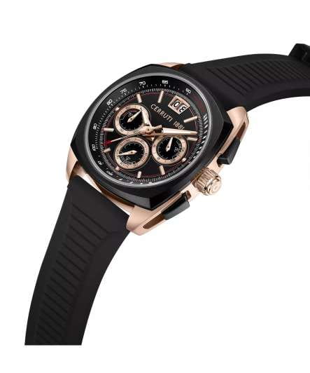 Мужские кварцевые часы Cerruti 1881 Cuneo CIWGO0085102 — спортивный аксессуар с французским дизайном и расширенным функционалом. Корпус из нержавеющей стали 316L с IP-покрытиемIP-покрытиеМетод ионного напыления. Демонстрирует повышенную устойчивость к истиранию, окислению и химическим веществам. Под воздействием высокого давления и температуры около 1500°C молекулы металла надёжно соединяются с частицами корпуса часов., размером 41.3 мм. Циферблат — чёрный с золотыми элементами, с штриховыми метками и окошком даты в положении 12 часов. Стекло — минеральноеМинеральное стеклоМинеральное стекло представляет собой искусственно выращенный минерал кварца. Такое стекло отличается особой устойчивостью к повреждениям и царапинам. Уступает по некоторым качествам сапфировому стеклу. с сапфировым покрытием. Стрелки и метки с люминесцентным покрытиемЛюминесцентное покрытиеПозволяет считывать показания времени в темноте. Производители наносят на стрелки, часовые индексы, безель или поверхность циферблата светонакопительный состав, дающий холодное свечение.. Функции: хронографХронографФункция позволяет измерять отрезки времени с особой точностью: часы, минуты, секунды. Верным признаком хронографа является наличие на циферблате 3 дополнительных окошек-счётчиков., тахиметрТахиметрРазмеченная шкала, располагается на ободке или безеле часов. Тахиметр позволяет рассчитать скорость на определённом участке пути, расстояние измеряется в километрах или милях., секундомер. Ремешок — чёрный силиконовый на стандартной застёжке. Водонепроницаемость 50 м. Идеальный выбор для тех, кто ценит французский дизайн и спортивный стиль.