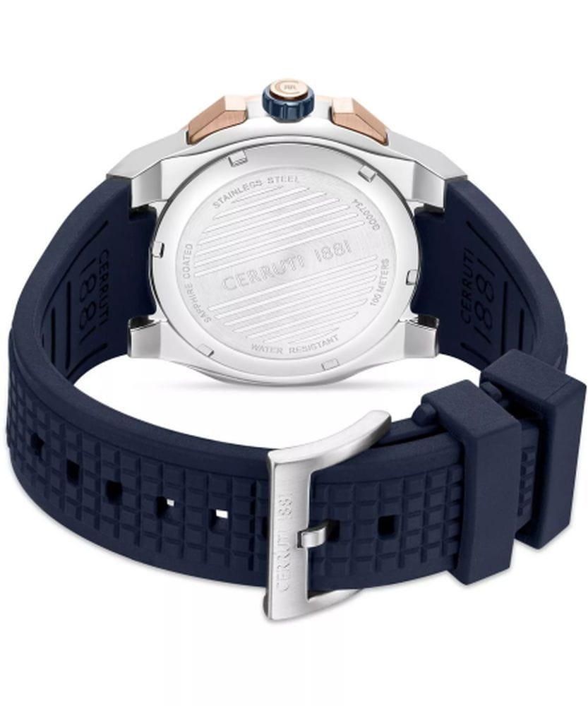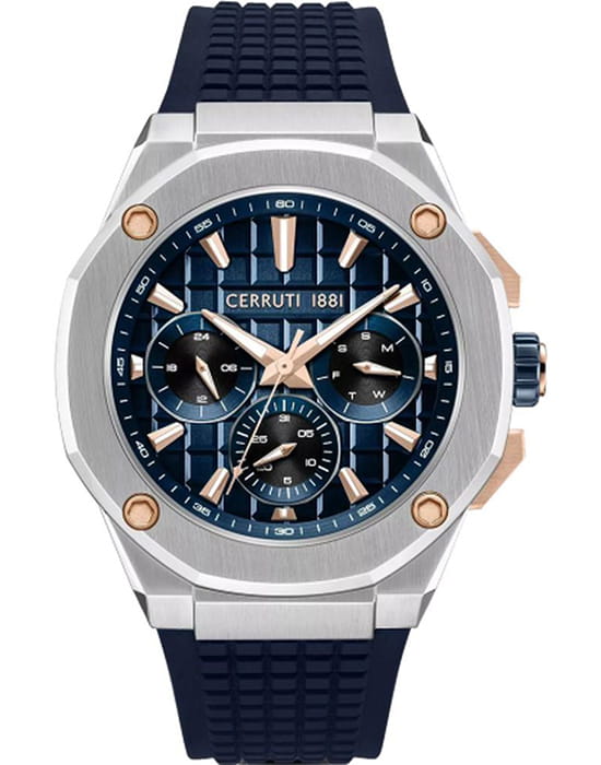 Cerruti 1881 CIWGQ0073402 — стильные мужские часы с выразительным индустриальным дизайном, в которых сочетаются спортивная энергия и итальянская элегантность. Корпус из нержавеющей стали с массивным безелемБезельВнешний ободок, закрепляющий стекло. В спортивных часах так называется поворотное кольцо с делениями на циферблате, выполняет роль таймера – замеряет отрезки времени на шкале. Неподвижный безель – элемент декора. Однонаправленно вращающийся безель на дайверских часах позволяет фиксировать моменты погружения и выныривания на поверхность. и декоративными винтами придаёт модели мощный и мужественный облик. Глубокий циферблат с тремя счётчиками хронографаХронографФункция позволяет измерять отрезки времени с особой точностью: часы, минуты, секунды. Верным признаком хронографа является наличие на циферблате 3 дополнительных окошек-счётчиков. подчёркивает технический характер часов, а контрастные стрелки и метки с люминесцентным покрытиемЛюминесцентное покрытиеПозволяет считывать показания времени в темноте. Производители наносят на стрелки, часовые индексы, безель или поверхность циферблата светонакопительный состав, дающий холодное свечение. обеспечивают отличную читаемость при любом освещении. Прочное минеральное стеклоМинеральное стеклоМинеральное стекло представляет собой искусственно выращенный минерал кварца. Такое стекло отличается особой устойчивостью к повреждениям и царапинам. Уступает по некоторым качествам сапфировому стеклу. защищает циферблат от царапин, а эластичный силиконовый ремешок гарантирует комфорт при повседневном ношении. Cerruti 1881 — гармоничное сочетание функциональности, надёжности и узнаваемого итальянского стиля, идеально подходящее для активных и уверенных мужчин.