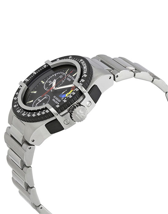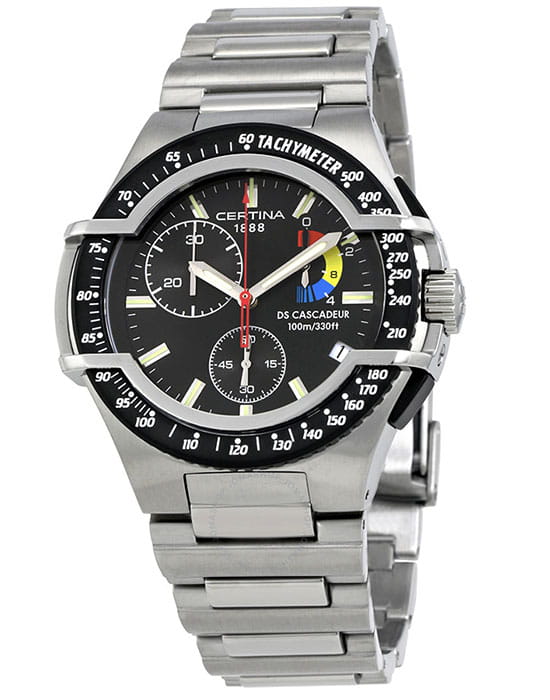 Надёжный корпус основан на концепции Двойной Надёжности DSDS ConceptDouble Security Concept, обозначает двойную надёжность и безупречную точность часов Certina. Двойная система защиты подразумевает обеспечение максимальной устойчивости к ударам и высоких показателей водонепроницаемости., выполнен из стали 316L с частичным PVD-финишемPVDУльтратонкое покрытие наносится в технике вакуумного напыления, сочетает в себе нитрид титана особой прочности со слоем золота или оксида хрома. Несёт в себе декоративную или защитную функцию.. Модель оснащена тахиметромТахиметрРазмеченная шкала, располагается на ободке или безеле часов. Тахиметр позволяет рассчитать скорость на определённом участке пути, расстояние измеряется в километрах или милях., секундомером, календарём, хронографомХронографФункция позволяет измерять отрезки времени с особой точностью: часы, минуты, секунды. Верным признаком хронографа является наличие на циферблате 3 дополнительных окошек-счётчиков.. Работу часов обеспечивает швейцарский кварцевый калибр ETA G10.211.