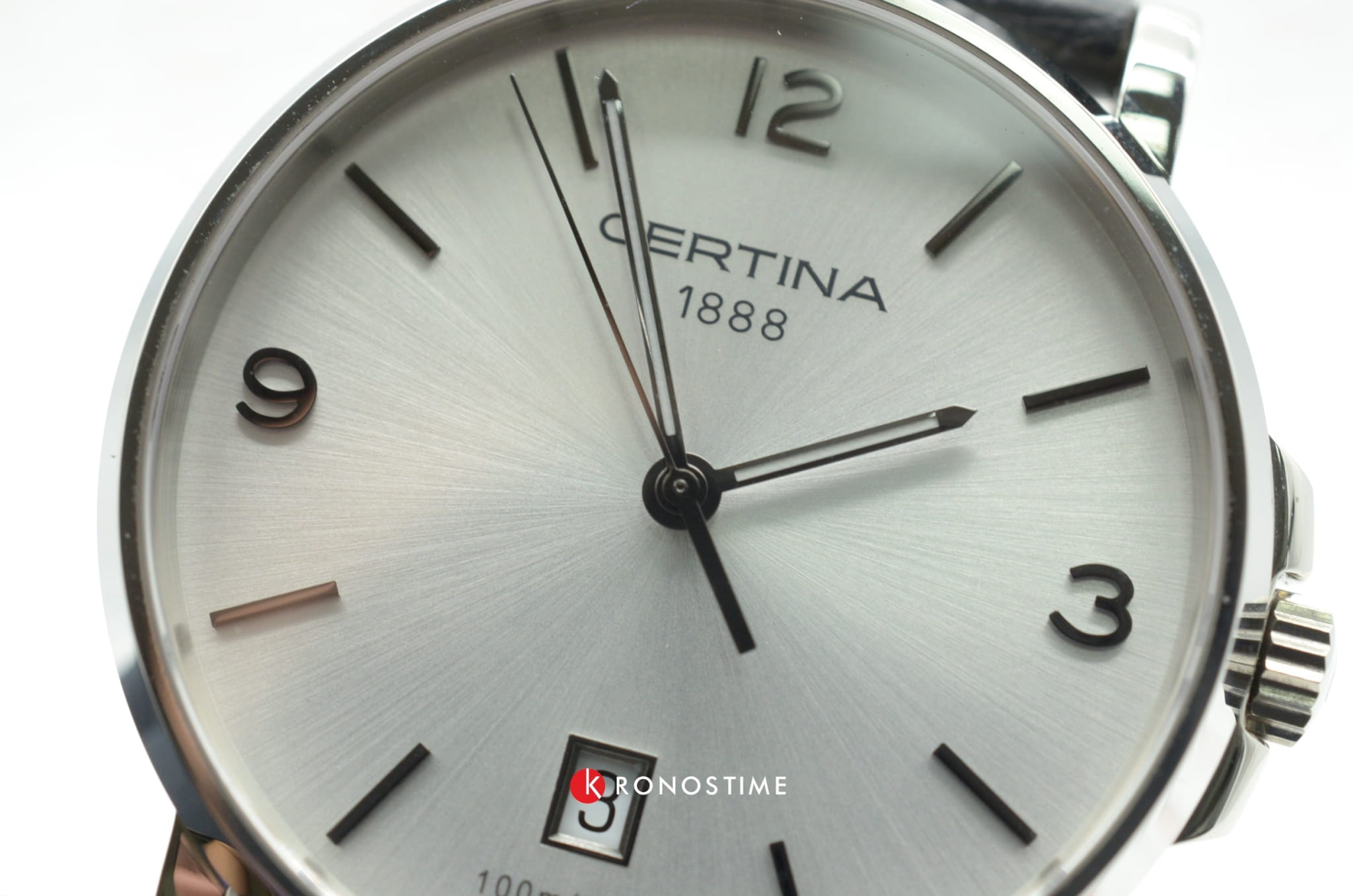 Брендовый аксессуар в чёрно-серебристой цветовой гамме отличается безупречным качеством ввиду применения надёжных современных материалов: стекло из сапфира, устойчивое к появлению царапин, натуральная кожа для изготовления ремешка, прочный корпус из хирургической стали 316L. Швейцарский кварцевый калибр ETA F06.111 обеспечивает абсолютную точность показаний. Сохранение водонепроницаемости до 10 бар. Система DS ConceptDS ConceptDouble Security Concept, обозначает двойную надёжность и безупречную точность часов Certina. Двойная система защиты подразумевает обеспечение максимальной устойчивости к ударам и высоких показателей водонепроницаемости.. Отображение текущего числа, функция EOLEOLПредставляет собой систему, уведомляющую владельца часов о необходимости замены элемента питания. За 2 недели до полного разряда батарейки секундная стрелка перестаёт ходить чётко и начинает перепрыгивать на 3-4 деления.. Диаметр корпуса: 38 мм.