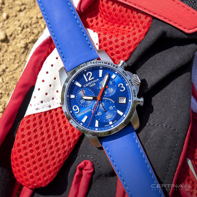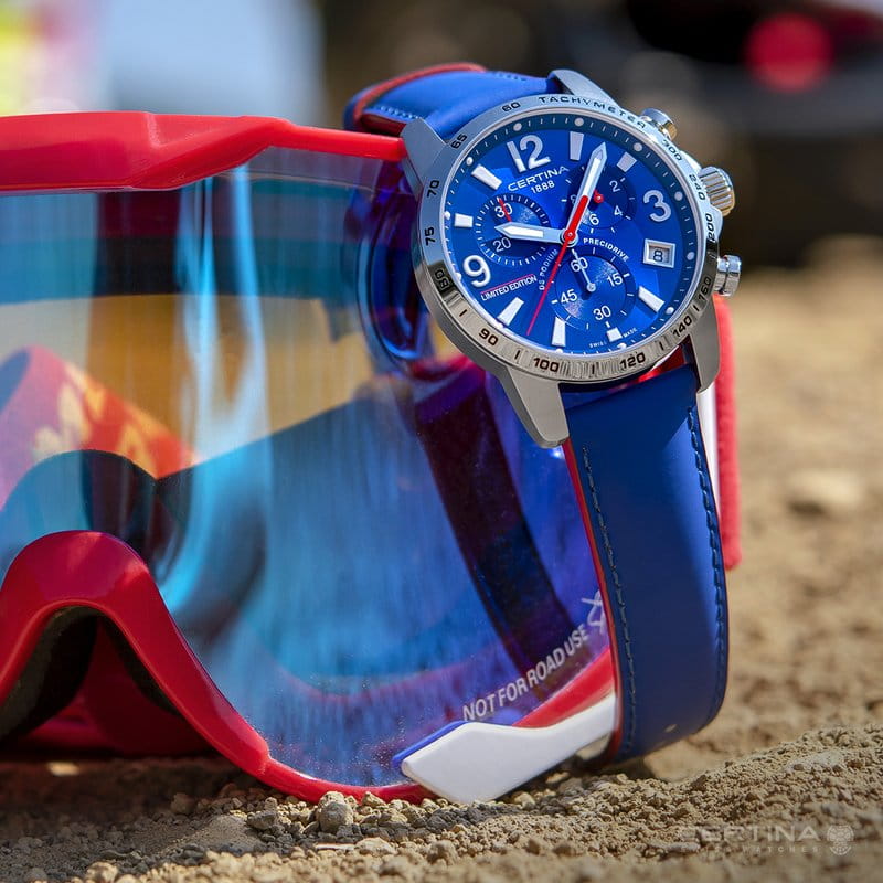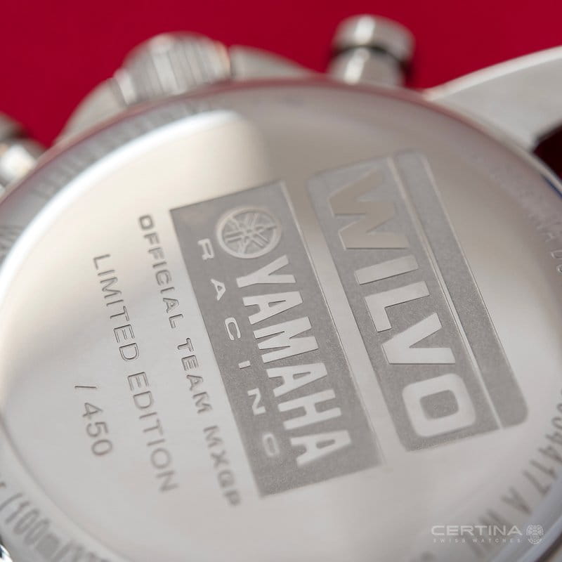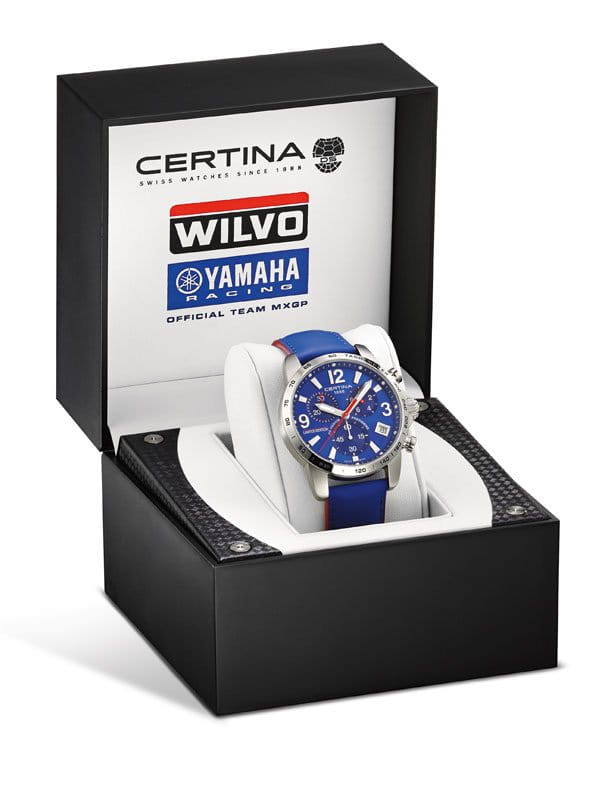 Новые пронумерованные модели DS Podium Chronograph 1/10sec Wilvo Limited Edition доступны в количестве 450 экземпляров Некоторые из моделей уже забронированы – и не без оснований: помимо менеджера команды Луиса Востерса эксклюзивные модели часов из рук президента Certina Адриана Боссара в Фрауэнфельде получат гонщики Wilvo Джереми Сивер, Шон Симпсон и Арно Тонус Разумеется, номера часов будут соответствовать номерам гонщиков: Джереми получит модель номер 91, Шон – 24 и Арно – номер 4 Новые модели переливаются синими бликами в официальном оттенке команды Wilvo Yamaha Official MXGP, дополненном красными стрелками хронографа Корпус из нержавеющей стали диаметром 41 мм скрывает ультрасовременный кварцевый часовой механизм Precidrive™, позволяющий отсчитывать десятые доли секунды в режиме реального времени Динамичное зрелище – как раз в духе MXGP!
