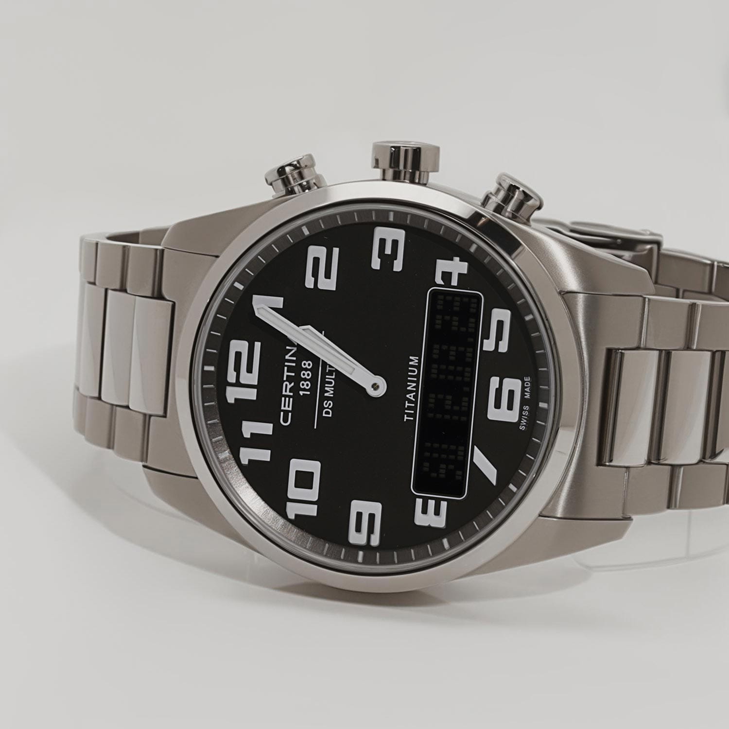 Мужские швейцарские кварцевые водонепроницаемые часы с будильникомБудильникБуди́льник — часы, в заданный момент времени подающие звуковой, световой и/или в редких случаях другой сигнал. Certina DS Multi C020.419.44.082.01, кварцевый механизм с высокой точностью. Сапфировое стеклоСапфировое стеклоПрочный и надёжный материал из кристалла сапфира синтетического происхождения, характеризующийся особой твёрдостью и устойчивостью к царапинам и повреждениям. устойчивое к появлению царапин, обладающее высокой прозрачностью. Класс водозащиты: 100 метров, позволит плавать, нырять и заниматься другими водными видами спорта. Корпус часов изготовлен из титана. Титановый браслет на раскладной застёжкеРаскладная застёжкаТакой тип застёжки используется только на браслетах из металла. Она никогда не раскрывается полностью, происходит разделение на 2 и более частей. Раскладывающая застёжка снизит вероятность потери часов к минимуму.. Круглый титановый корпус c сатинированной поверхностью. Стильный инверсионный матричный дисплей расширяет функционал часов. Второй часовой поясВторой часовой поясФункция, позволяющая отображать время двух часовых поясов одновременно. отображается на цифровом дисплее. Заостренные прямоугольные стрелки в стиле Baton с люминесцентным покрытиемЛюминесцентное покрытиеПозволяет считывать показания времени в темноте. Производители наносят на стрелки, часовые индексы, безель или поверхность циферблата светонакопительный состав, дающий холодное свечение., которое светится в темноте после непродолжительной зарядки на свету. Метки в виде арабских цифр. Задняя крышка крепится на винтах.