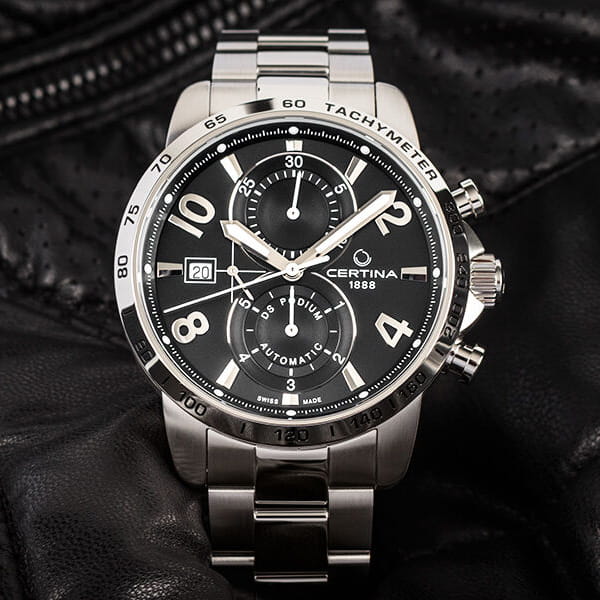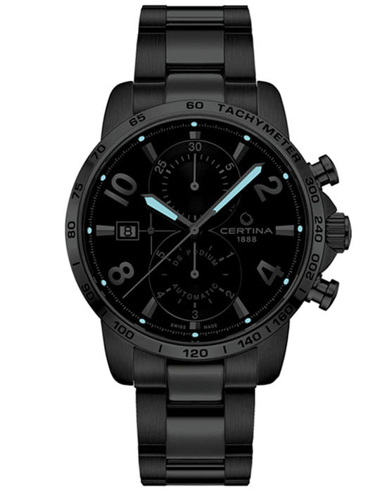 Наручные часы гармонично объединяет лаконичность чёрного циферблата и металлический блеск нержавеющей стали 316L. Спортивный аксессуар будет идеальным компаньоном для повседневного образа. Швейцарский механический калибр C01.211. Водонепроницаемость до 10 бар. Реализация концепции DS ConceptDS ConceptDouble Security Concept, обозначает двойную надёжность и безупречную точность часов Certina. Двойная система защиты подразумевает обеспечение максимальной устойчивости к ударам и высоких показателей водонепроницаемости.. Антибликовая обработка для сапфирового стекла. Люминесцентная подсветкаЛюминесцентное покрытиеПозволяет считывать показания времени в темноте. Производители наносят на стрелки, часовые индексы, безель или поверхность циферблата светонакопительный состав, дающий холодное свечение.. Заводная головка с защитой. Ударопрочный корпусУдаропрочный корпусМеханизм заключён в корпус, выполненный из современных материалов, устойчивых к ударам, механическим повреждениям и падению с высоты: инновационный пластик, карбон, нержавеющая сталь, титан.. Предохранительная . Окошко даты, шкала тахиметраТахиметрРазмеченная шкала, располагается на ободке или безеле часов. Тахиметр позволяет рассчитать скорость на определённом участке пути, расстояние измеряется в километрах или милях., секундомер, хронографХронографФункция позволяет измерять отрезки времени с особой точностью: часы, минуты, секунды. Верным признаком хронографа является наличие на циферблате 3 дополнительных окошек-счётчиков.. Диаметр корпуса: 41 мм.