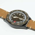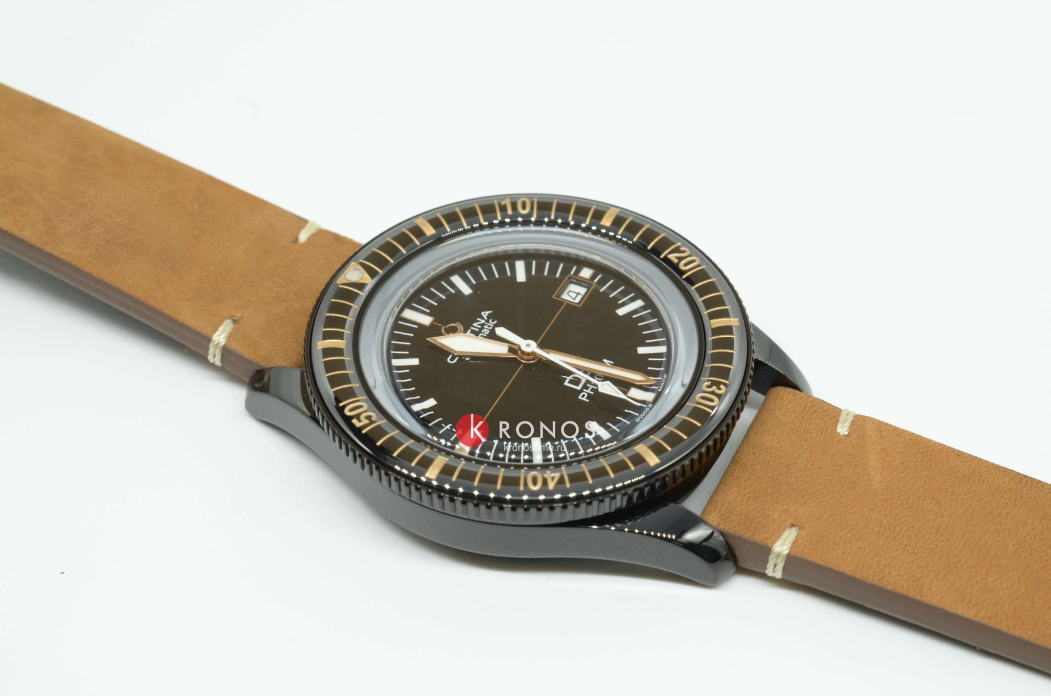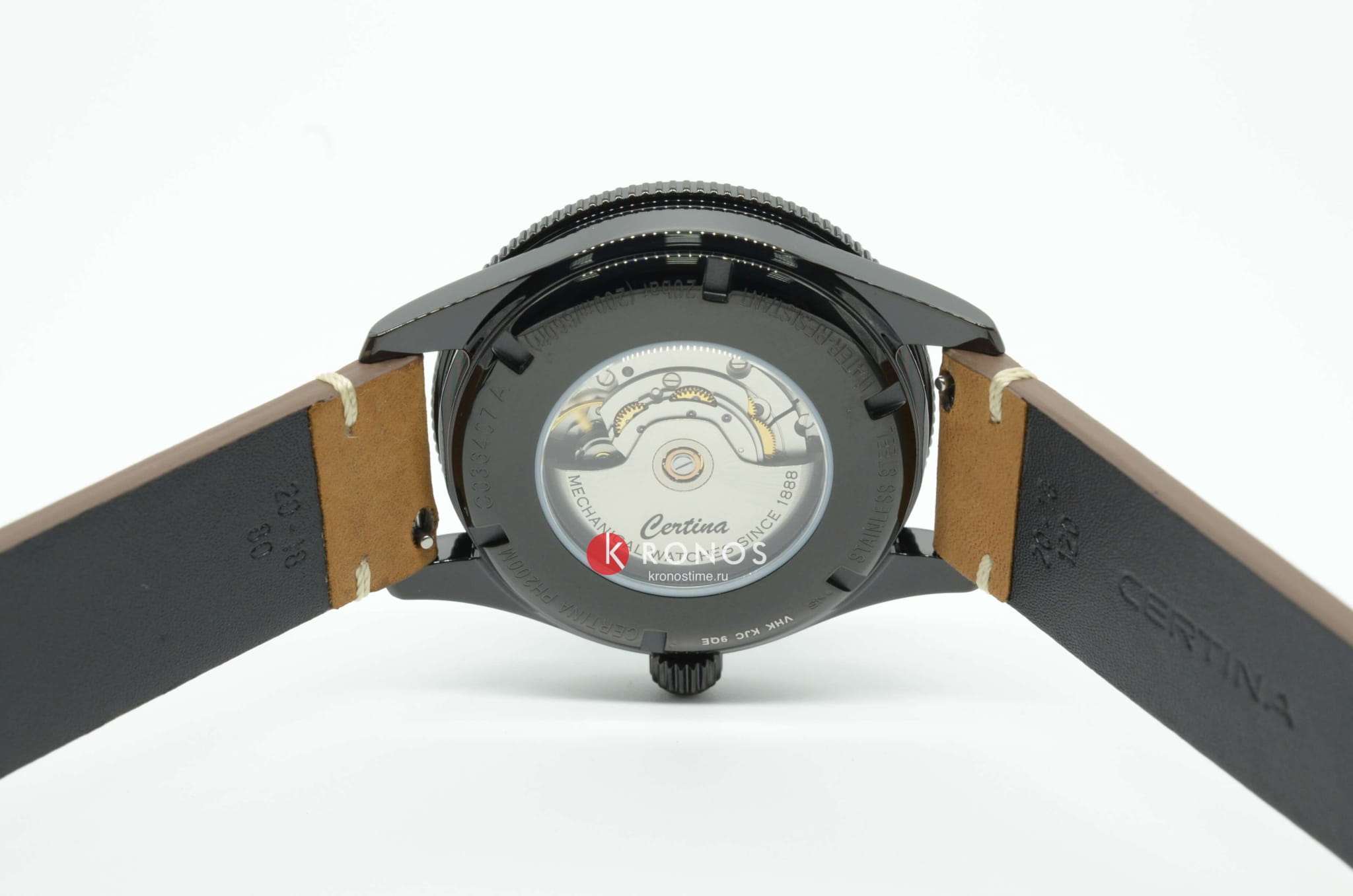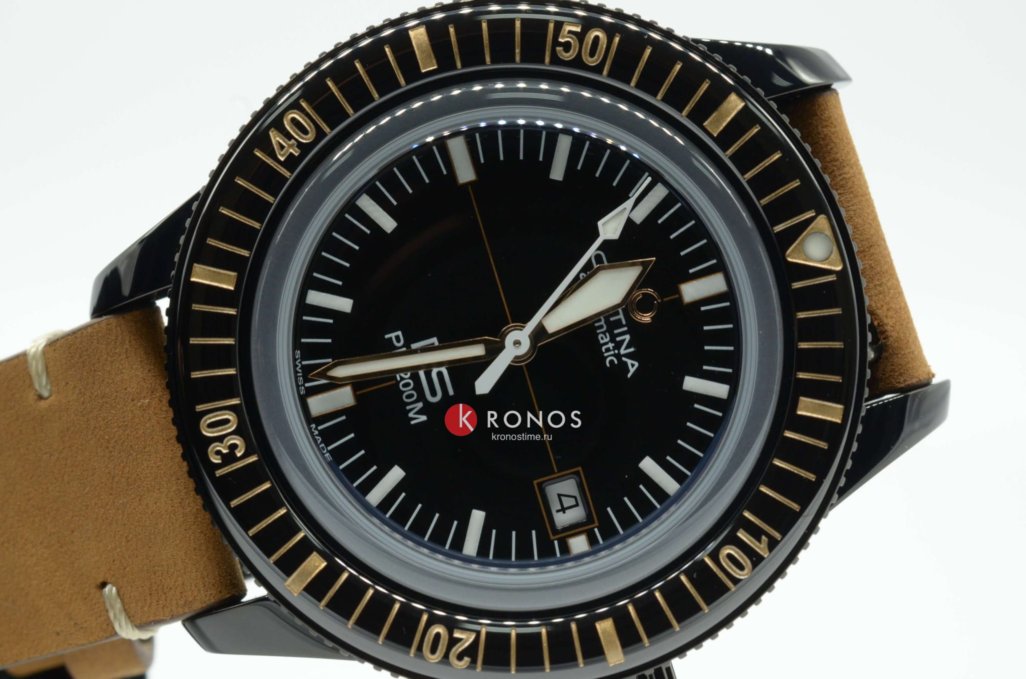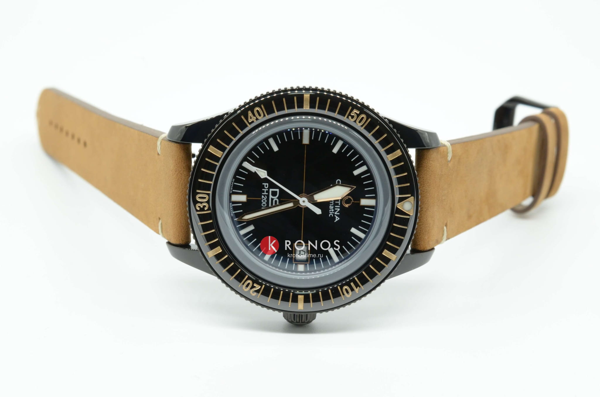 Оригинальный циферблат понравится ценителям ретро-дизайна. В комплекте с кожаным ремешком вы получаете дополнительный вариант из текстиля. Меняя их, вы можете экспериментировать с разными стилями. Уникальностью обладает не только аксессуар, но и упаковка, сделанная в виде бокса для дайвинга. Часы комплектуются автоматическим механизмом ETA Powermatic 80Powermatic 80Эксклюзивный калибр от швейцарской компании ETA с увеличенным запасом хода до 80 часов за счёт удлинённой заводной пружины. Характеризуется улучшенной системой спуска со сниженным трением. с 80-часовым запасом хода. Технология DS ConceptDS ConceptDouble Security Concept, обозначает двойную надёжность и безупречную точность часов Certina. Двойная система защиты подразумевает обеспечение максимальной устойчивости к ударам и высоких показателей водонепроницаемости.. Стекло с покрытием Nex scratchguard, устойчивым к царапинам. Вращающийся безельБезельВнешний ободок, закрепляющий стекло. В спортивных часах так называется поворотное кольцо с делениями на циферблате, выполняет роль таймера – замеряет отрезки времени на шкале. Неподвижный безель – элемент декора. Однонаправленно вращающийся безель на дайверских часах позволяет фиксировать моменты погружения и выныривания на поверхность.. Диаметр корпуса: 42,8 мм.