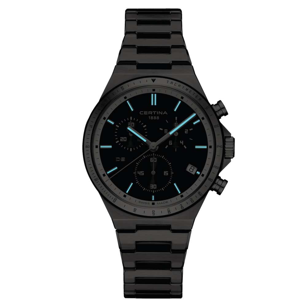 Certina DS-7 Chronograph ХронографФункция позволяет измерять отрезки времени с особой точностью: часы, минуты, секунды. Верным признаком хронографа является наличие на циферблате 3 дополнительных окошек-счётчиков. C043.417.22.051.00– мужские часы для поклонников ярких аксессуаров. И корпус, и браслет изготовлены из высококачественного титана . Под твердым сапфировым стекломСапфировое стеклоПрочный и надёжный материал из кристалла сапфира синтетического происхождения, характеризующийся особой твёрдостью и устойчивостью к царапинам и повреждениям. с антибликовым покрытиемАнтибликовое покрытиеСлой оксида металла в 0,13-0,3 микрон, благодаря которому стекло часов не бликует и не отражает свет. Антибликовое покрытие уменьшает отражение света в 10 раз, обеспечивая отличную читаемость показателей циферблата. находится черный циферблат и на котором вы найдете окошко даты в положении 4 часа, а также маркировку, покрытую люминесцентным покрытиемЛюминесцентное покрытиеПозволяет считывать показания времени в темноте. Производители наносят на стрелки, часовые индексы, безель или поверхность циферблата светонакопительный состав, дающий холодное свечение. Super-LumiNova. Класс водозащиты: 100 метров, позволит плавать, нырять и заниматься другими водными видами спорта. Титановый браслет на застёжке-бабочке с кнопкамиЗастёжка "бабочка"Такой вид застёжки дополняется предохранителями, помогающими избежать случайного раскрытия браслета. Обладают изящным исполнением. .ТахиметрТахиметрРазмеченная шкала, располагается на ободке или безеле часов. Тахиметр позволяет рассчитать скорость на определённом участке пути, расстояние измеряется в километрах или милях.