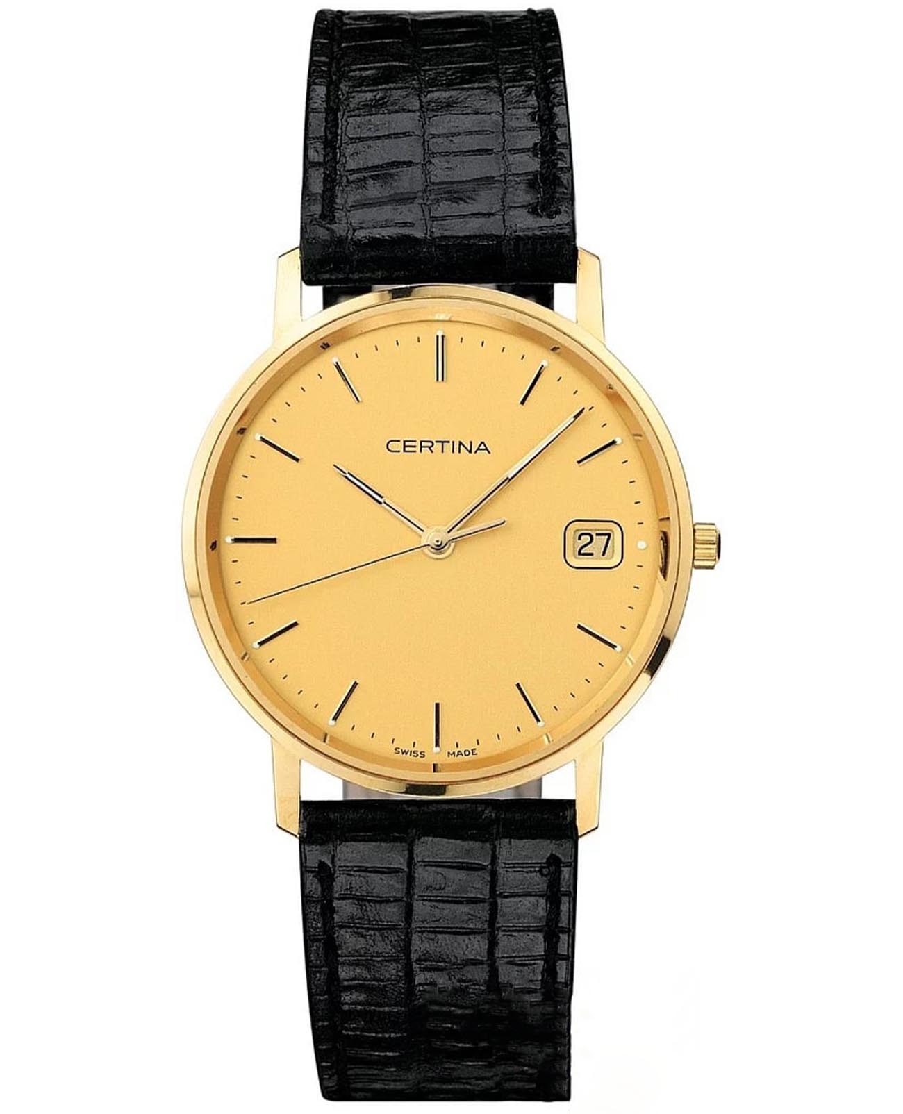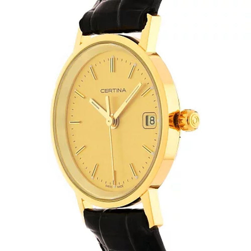 Женские швейцарские часы Certina PRISKA GOLD C158.9289.68.31. Золотой циферблат соединен с корпусом из 18-каратного желтого золота. Идеальным дополнением станет черный ремешок из натуральной кожи. За точное измерение времени отвечает швейцарский кварцевый механизм ETA 256.111 с аккумулятором EOL. Инновационная прокладка из биоматериала обеспечивает идеальное уплотнение. Наряду с часовой, минутной и секундной стрелками часы имеют окошко даты на отметке «3 часа». Водозащита 30 метров, позволит защитить корпус от случайных брызг или капель дождя. Сапфировое стеклоСапфировое стеклоПрочный и надёжный материал из кристалла сапфира синтетического происхождения, характеризующийся особой твёрдостью и устойчивостью к царапинам и повреждениям. устойчивое к появлению царапин, обладающее высокой прозрачностью. Браслет из натуральной кожи сочетает в себе стиль и долговечность. Стрелки с люминесцентным покрытиемЛюминесцентное покрытиеПозволяет считывать показания времени в темноте. Производители наносят на стрелки, часовые индексы, безель или поверхность циферблата светонакопительный состав, дающий холодное свечение..