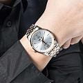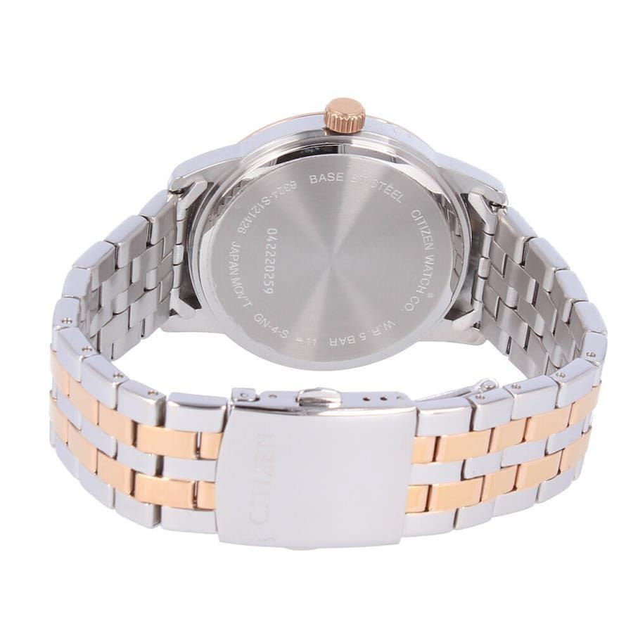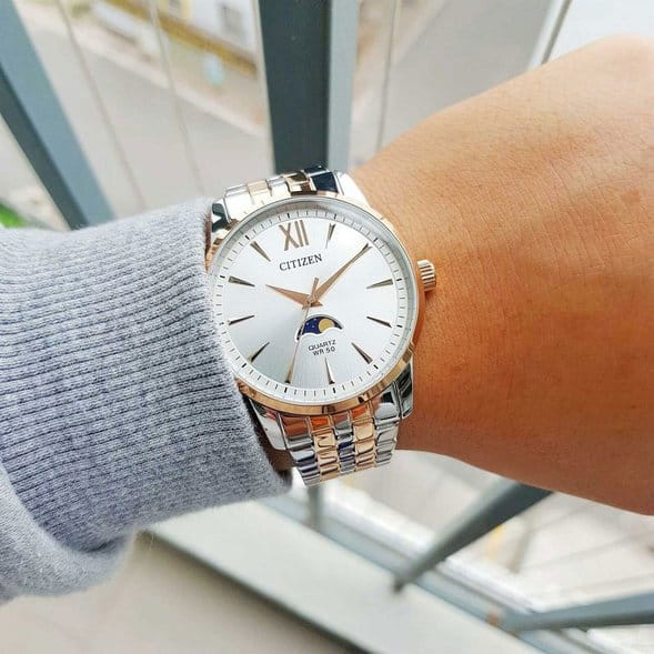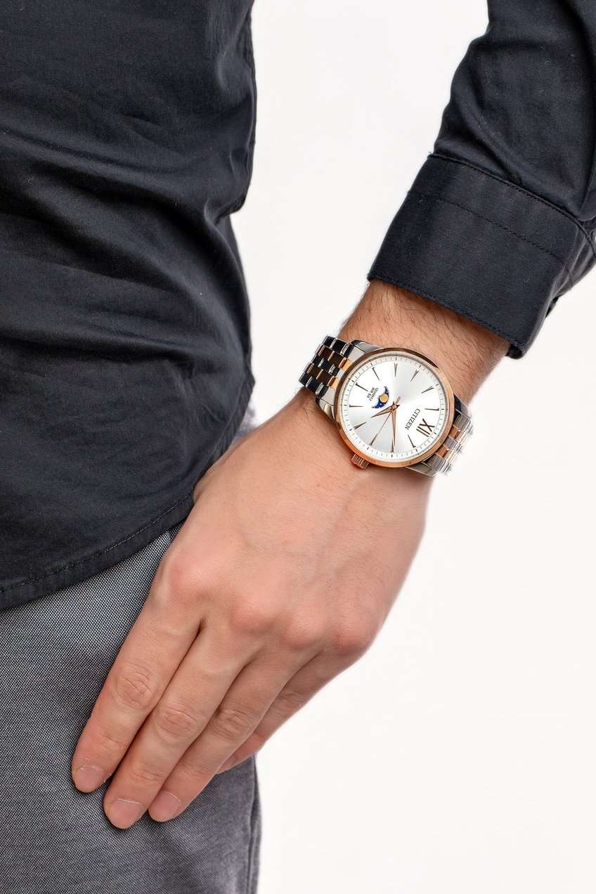 Часы Citizen AK5006-58A произведены в Японии и оснащены надёжным кварцевым механизмом калибра Citizen 6324. Корпус выполнен из нержавеющей стали и имеет классическую круглую форму диаметром 42 мм, а безельБезельВнешний ободок, закрепляющий стекло. В спортивных часах так называется поворотное кольцо с делениями на циферблате, выполняет роль таймера – замеряет отрезки времени на шкале. Неподвижный безель – элемент декора. Однонаправленно вращающийся безель на дайверских часах позволяет фиксировать моменты погружения и выныривания на поверхность. с элегантным золотистым IP-покрытиемIP-покрытиеМетод ионного напыления. Демонстрирует повышенную устойчивость к истиранию, окислению и химическим веществам. Под воздействием высокого давления и температуры около 1500°C молекулы металла надёжно соединяются с частицами корпуса часов.. Минеральное стеклоМинеральное стеклоМинеральное стекло представляет собой искусственно выращенный минерал кварца. Такое стекло отличается особой устойчивостью к повреждениям и царапинам. Уступает по некоторым качествам сапфировому стеклу. защищает серебристый циферблат, украшенный эффектом солнечных лучей по технологии Sunray. На циферблате расположены клиновидные стрелки в стиле Dauphine, метки в виде штрихов и римская цифра в положении 12 часов, а также индикатор фазы Луны — одно из самых востребованных усложнений в часовой классике. Часы защищены от воды по стандарту 50WR, что позволяет не бояться случайных брызг и дождя. Заводная головка отличается рифлёной поверхностью для удобства использования. Стальной браслет с частичным золотистым IP-покрытиемIP-покрытиеМетод ионного напыления. Демонстрирует повышенную устойчивость к истиранию, окислению и химическим веществам. Под воздействием высокого давления и температуры около 1500°C молекулы металла надёжно соединяются с частицами корпуса часов. и раскладной застёжкойРаскладная застёжкаТакой тип застёжки используется только на браслетах из металла. Она никогда не раскрывается полностью, происходит разделение на 2 и более частей. Раскладывающая застёжка снизит вероятность потери часов к минимуму. обеспечивает комфорт и надежную фиксацию на руке. В качестве элемента питания используется батарейка SR621SW, обеспечивающая автономную работу до двух лет.