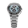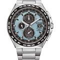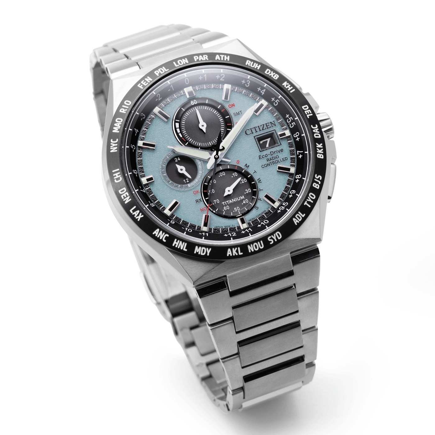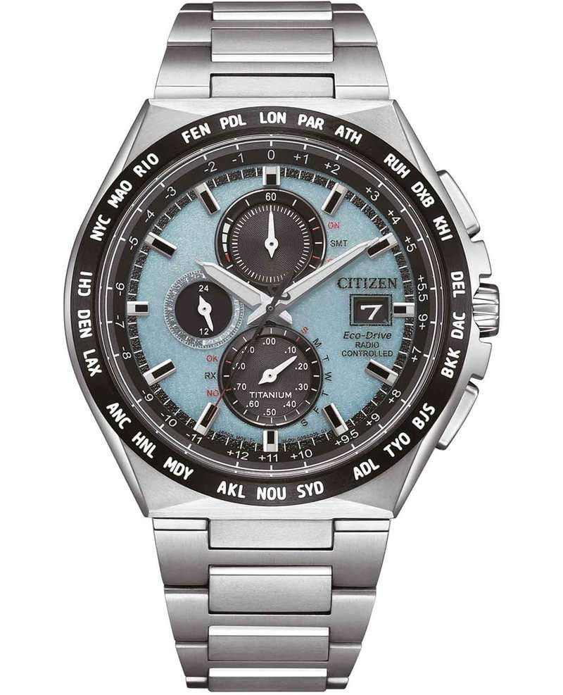 Японские наручные часы Citizen AT8238-84M сочетают в себе передовые технологии, надежность и стильный современный дизайн. Корпус и браслет выполнены из высокопрочного материала Super Titanium, который в пять раз тверже и на 40% легче стали, а также отличается высокой устойчивостью к царапинам и коррозии, а на безельБезельВнешний ободок, закрепляющий стекло. В спортивных часах так называется поворотное кольцо с делениями на циферблате, выполняет роль таймера – замеряет отрезки времени на шкале. Неподвижный безель – элемент декора. Однонаправленно вращающийся безель на дайверских часах позволяет фиксировать моменты погружения и выныривания на поверхность. нанесено черное IP-покрытиеIP-покрытиеМетод ионного напыления. Демонстрирует повышенную устойчивость к истиранию, окислению и химическим веществам. Под воздействием высокого давления и температуры около 1500°C молекулы металла надёжно соединяются с частицами корпуса часов.. Диаметр корпуса составляет 43,5 мм, толщина — 10 мм, а вес — всего 90 грамм, что обеспечивает легкость и комфорт при ежедневном ношении. Часы оснащены кварцевым хронографомХронографФункция позволяет измерять отрезки времени с особой точностью: часы, минуты, секунды. Верным признаком хронографа является наличие на циферблате 3 дополнительных окошек-счётчиков. на солнечной батарее с системой Eco-Drive, не требующей замены батарейки, и калибром Citizen H800, обеспечивающим до 6 месяцев работы без подзарядки и защиту от перезаряда. Особенностью модели является автоматическая синхронизация времени по радиосигналу в четырех регионах мира, охватывающая 26 часовых зон, а также функция мирового времениМировое время Полезное часовое усложнение, отображающее время в основных городах и известных областях по всему миру, оно связано с часовыми поясами, удобно для путешественников и бизнесменов. и вечного календаряВечный календарьКлассическое часовое усложнение, представляющее собой календарь, рассчитанный на несколько лет вперёд (стандартно – до 2099 года). Определяет текущую дату, день недели, месяц., рассчитанного до 2100 года. На голубом циферблате расположены центральные часовая и минутная стрелки с люминесцентным покрытиемЛюминесцентное покрытиеПозволяет считывать показания времени в темноте. Производители наносят на стрелки, часовые индексы, безель или поверхность циферблата светонакопительный состав, дающий холодное свечение. для отличной читаемости в темноте, а также апертура даты в позиции 3 часов и отдельный малый циферблат для секундной стрелки. Часы поддерживают 12/24-часовой формат времени, оснащены секундомеромСекундомерСекундоме́р — прибор, способный измерять интервалы времени с точностью до долей секунды. с точностью 1/20 секунды и максимальным временем измерения 60 минут, а также индикатором окончания ресурса элемента питания EOLEOLПредставляет собой систему, уведомляющую владельца часов о необходимости замены элемента питания. За 2 недели до полного разряда батарейки секундная стрелка перестаёт ходить чётко и начинает перепрыгивать на 3-4 деления.. Устойчивое к царапинам сапфировое стеклоСапфировое стеклоПрочный и надёжный материал из кристалла сапфира синтетического происхождения, характеризующийся особой твёрдостью и устойчивостью к царапинам и повреждениям. с антибликовым покрытиемАнтибликовое покрыти