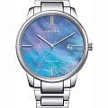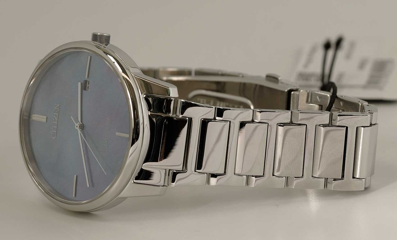 Citizen BM7520-88N — изысканные японские часы, впечатляющие гармоничным сочетанием современного стиля и элегантности. Корпус и браслет выполнены из прочной нержавеющей стали, что обеспечивает надежность и долговечность модели. Особое внимание привлекает перламутровый голубой циферблат с аккуратными метками в виде штрихов, который придает часам утонченный и оригинальный вид. Часы оснащены кварцевым механизмом Citizen E111 с передовой системой Eco-Drive, работающей на солнечной энергии и не требующей замены батарейки, а запас хода составляет до 180 дней. Продуманная функция индикации окончания заряда EOLEOLПредставляет собой систему, уведомляющую владельца часов о необходимости замены элемента питания. За 2 недели до полного разряда батарейки секундная стрелка перестаёт ходить чётко и начинает перепрыгивать на 3-4 деления. и предотвращения перезарядки гарантирует стабильную работу. Сапфировое стеклоСапфировое стеклоПрочный и надёжный материал из кристалла сапфира синтетического происхождения, характеризующийся особой твёрдостью и устойчивостью к царапинам и повреждениям. надежно защищает циферблат от царапин, а водозащита 50WR позволяет не беспокоиться о попадании влаги при повседневном использовании. Окошко с датой удобно расположено на отметке 3 часа. Браслет снабжен раскладной застёжкойРаскладная застёжкаТакой тип застёжки используется только на браслетах из металла. Она никогда не раскрывается полностью, происходит разделение на 2 и более частей. Раскладывающая застёжка снизит вероятность потери часов к минимуму., обеспечивающей комфортную посадку на запястье. Диаметр корпуса составляет 39,2 мм, толщина — 9,5 мм, вес — 137 г. Эта модель отлично подойдет тем, кто ценит стиль, надежность и современные технологии.