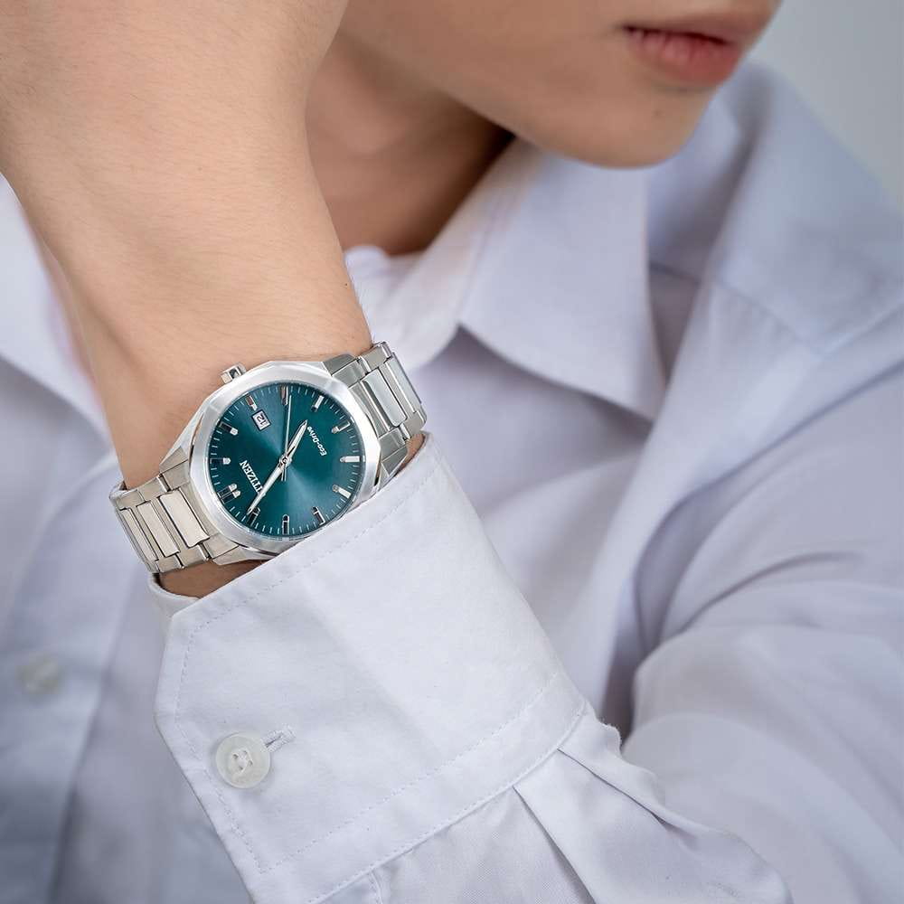 Citizen BM7620-83X — элегантные японские часы с современным кварцевым механизмом Citizen E111 и инновационной системой Eco-Drive, которая работает от солнечной энергии и не требует замены батарейки, обеспечивая автономную работу до 180 дней. Корпус и браслет выполнены из нержавеющей стали, что придает часам стильный и износостойкий внешний вид. Темно-зеленый циферблат с изящным эффектом Sunray украшен минималистичными часовыми метками в виде штрихов и дополнен окошком даты на позиции 3 часа для удобства контроля времени. Стрелки с люминесцентным покрытиемЛюминесцентное покрытиеПозволяет считывать показания времени в темноте. Производители наносят на стрелки, часовые индексы, безель или поверхность циферблата светонакопительный состав, дающий холодное свечение. обеспечивают отличную читаемость времени даже в темное время суток. Прочное минеральное стеклоМинеральное стеклоМинеральное стекло представляет собой искусственно выращенный минерал кварца. Такое стекло отличается особой устойчивостью к повреждениям и царапинам. Уступает по некоторым качествам сапфировому стеклу. надежно защищает циферблат от случайных повреждений. Водозащита 100WR позволяет использовать часы во время плавания и занятий спортом без риска повреждения. Диаметр корпуса составляет 38 мм, толщина — 9,7 мм, вес — 118 грамм, что делает модель удобной для ежедневного ношения. Браслет оснащен надежной раскладной застёжкойРаскладная застёжкаТакой тип застёжки используется только на браслетах из металла. Она никогда не раскрывается полностью, происходит разделение на 2 и более частей. Раскладывающая застёжка снизит вероятность потери часов к минимуму. для максимального комфорта. Функции индикации заряда EOLEOLПредставляет собой систему, уведомляющую владельца часов о необходимости замены элемента питания. За 2 недели до полного разряда батарейки секундная стрелка перестаёт ходить чётко и начинает перепрыгивать на 3-4 деления. и предотвращения перезарядки делают эксплуатацию часов простой и безопасной.
