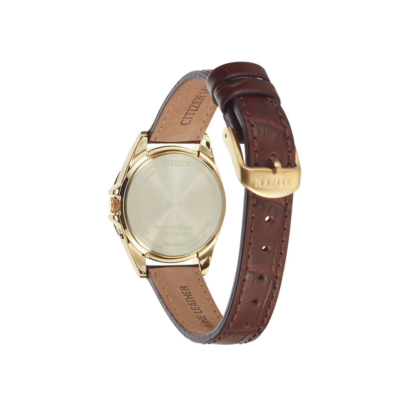 Citizen EC1183-16A — стильные и функциональные часы для современных леди, созданные в Японии. Модель оснащена точным кварцевым механизмом с калибром Citizen H246 и инновационной системой Eco-Drive, которая обеспечивает питание от солнечной энергии и избавляет от необходимости замены батарейки, а запас хода составляет до 180 дней. Для дополнительного удобства предусмотрены функции индикации заряда EOLEOLПредставляет собой систему, уведомляющую владельца часов о необходимости замены элемента питания. За 2 недели до полного разряда батарейки секундная стрелка перестаёт ходить чётко и начинает перепрыгивать на 3-4 деления., сохранения энергии и предотвращения перезарядки, а при включенной функции сохранения энергии часы способны работать до трёх лет. Корпус выполнен из высококачественной нержавеющей стали с золотистым IP-покрытиемIP-покрытиеМетод ионного напыления. Демонстрирует повышенную устойчивость к истиранию, окислению и химическим веществам. Под воздействием высокого давления и температуры около 1500°C молекулы металла надёжно соединяются с частицами корпуса часов., а белый циферблат украшен метками в виде штрихов и защищён сапфировым стекломСапфировое стеклоПрочный и надёжный материал из кристалла сапфира синтетического происхождения, характеризующийся особой твёрдостью и устойчивостью к царапинам и повреждениям. с высокой устойчивостью к царапинам. Стрелки с люминесцентным покрытиемЛюминесцентное покрытиеПозволяет считывать показания времени в темноте. Производители наносят на стрелки, часовые индексы, безель или поверхность циферблата светонакопительный состав, дающий холодное свечение. обеспечивают отличную читаемость времени даже в темное время суток. Окошко даты удобно расположено на отметке 3 часа, а вечный календарьВечный календарьКлассическое часовое усложнение, представляющее собой календарь, рассчитанный на несколько лет вперёд (стандартно – до 2099 года). Определяет текущую дату, день недели, месяц. всегда показывает актуальное число. Часы автоматически принимают сигналы от радиовышек по всему миру и корректируют время с высокой точностью — поддерживается синхронизация в Европе, США, Японии и Китае, а также мировое время для 24 городов и автоматический переход на зимнее и летнее время. Диаметр корпуса составляет 29,3 мм, толщина — 8,4 мм, вес — всего 67 грамм, что делает модель особенно комфортной для повседневного ношения. Заводная головка снабжена защитой, а коричневый кожаный ремешок оборудован удобной классической застежкой. Надёжная водозащита 100WR позволяет использовать часы даже при плавании.