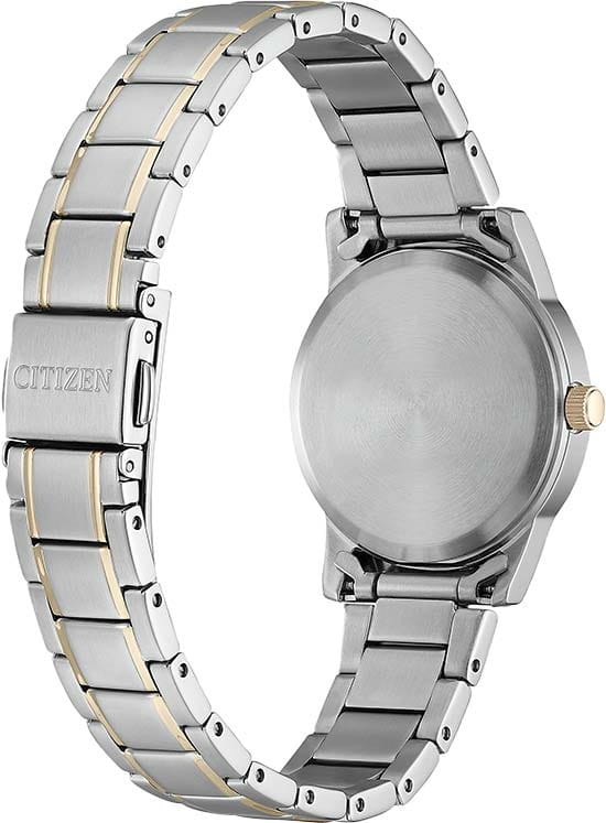 Элегантные часы Citizen FE1226-82A сочетают в себе классический дизайн и современные технологии. Модель изготовлена в Японии и оснащена кварцевым механизмом Citizen J710 с инновационной системой Eco-Drive, которая обеспечивает работу часов за счет солнечной энергии и не требует замены батарейки. Запас хода составляет до 240 дней, а функция индикации заряда позволяет всегда знать уровень энергии. Корпус и браслет выполнены из прочной нержавеющей стали, а безельБезельВнешний ободок, закрепляющий стекло. В спортивных часах так называется поворотное кольцо с делениями на циферблате, выполняет роль таймера – замеряет отрезки времени на шкале. Неподвижный безель – элемент декора. Однонаправленно вращающийся безель на дайверских часах позволяет фиксировать моменты погружения и выныривания на поверхность. и браслет (частично) с золотистым PVD-покрытиемPVDУльтратонкое покрытие наносится в технике вакуумного напыления, сочетает в себе нитрид титана особой прочности со слоем золота или оксида хрома. Несёт в себе декоративную или защитную функцию., надежная раскладная застёжкаРаскладная застёжкаТакой тип застёжки используется только на браслетах из металла. Она никогда не раскрывается полностью, происходит разделение на 2 и более частей. Раскладывающая застёжка снизит вероятность потери часов к минимуму. с системой блокировки обеспечивает дополнительную безопасность при ношении. Белый циферблат украшен окошком даты, а минеральное стеклоМинеральное стеклоМинеральное стекло представляет собой искусственно выращенный минерал кварца. Такое стекло отличается особой устойчивостью к повреждениям и царапинам. Уступает по некоторым качествам сапфировому стеклу. надежно защищает его от повреждений. Водозащита до 100 метров позволяет использовать часы в повседневной жизни и во время активного отдыха. Диаметр корпуса составляет 30 мм, толщина — 8,9 мм, вес — 69 г. Эта модель станет отличным выбором для тех, кто ценит надежность, стиль и современные технологии в одном аксессуаре.