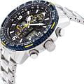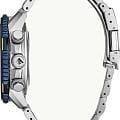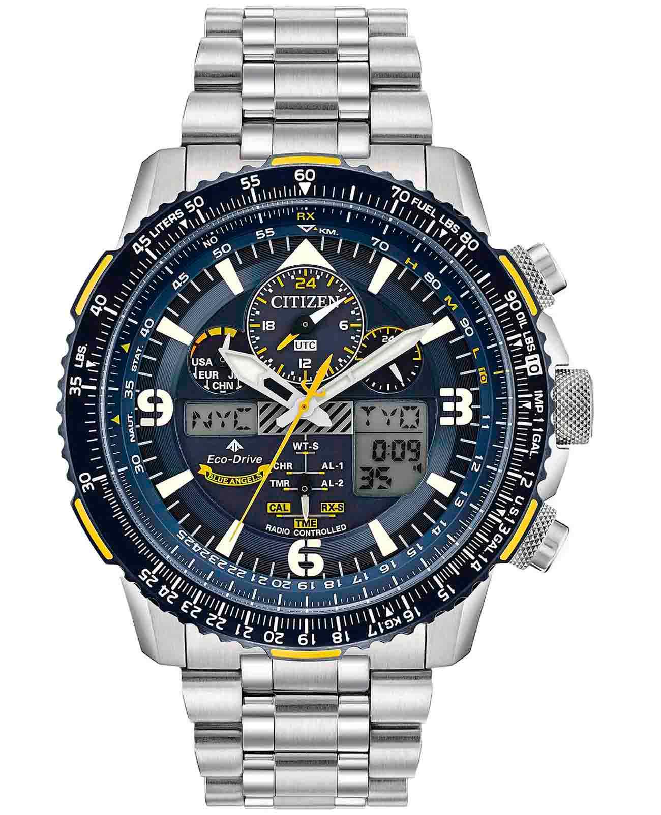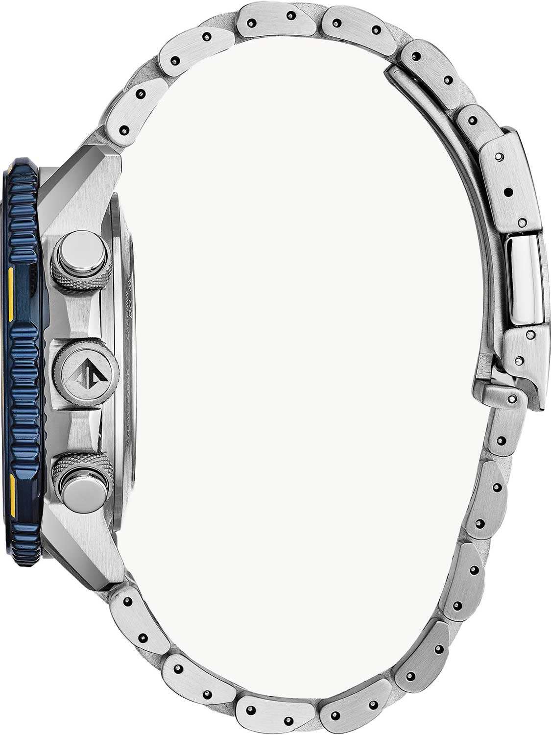 Citizen Promaster JY8078-52L часы-хронографХронографФункция позволяет измерять отрезки времени с особой точностью: часы, минуты, секунды. Верным признаком хронографа является наличие на циферблате 3 дополнительных окошек-счётчиков. с секундомеромСекундомерСекундоме́р — прибор, способный измерять интервалы времени с точностью до долей секунды. спортивного дизайна с высоким уровнем водозащиты. Корпус из нержавеющей стали диаметром 45,4 мм идеально сбалансирован. Сапфировое стеклоСапфировое стеклоПрочный и надёжный материал из кристалла сапфира синтетического происхождения, характеризующийся особой твёрдостью и устойчивостью к царапинам и повреждениям. с антибликовым покрытием обеспечивает отличную защиту циферблата от царапин. Часы работают на основе кварцевого механизма, питание от солнечной энергии. Стальной браслет на раскладной застёжкеРаскладная застёжкаТакой тип застёжки используется только на браслетах из металла. Она никогда не раскрывается полностью, происходит разделение на 2 и более частей. Раскладывающая застёжка снизит вероятность потери часов к минимуму. идеально дополняют дизайн часов, обеспечивая комфортное ношение. Стрелки и метки на циферблате имеют люминесцентное покрытиеЛюминесцентное покрытиеПозволяет считывать показания времени в темноте. Производители наносят на стрелки, часовые индексы, безель или поверхность циферблата светонакопительный состав, дающий холодное свечение. позволяющее легко определять время даже в темноте. Поворотный безельБезельВнешний ободок, закрепляющий стекло. В спортивных часах так называется поворотное кольцо с делениями на циферблате, выполняет роль таймера – замеряет отрезки времени на шкале. Неподвижный безель – элемент декора. Однонаправленно вращающийся безель на дайверских часах позволяет фиксировать моменты погружения и выныривания на поверхность. с IP-покрытиемIP-покрытиеМетод ионного напыления. Демонстрирует повышенную устойчивость к истиранию, окислению и химическим веществам. Под воздействием высокого давления и температуры около 1500°C молекулы металла надёжно соединяются с частицами корпуса часов.. Автоматический прием сигналов от радиовышек, расположенных в различных точках земного шара, которые передают временные сигналы от определенных атомных часов. Коррекция текущего времени радиосигналом на территории почти всей Европы, США, Японии и Китая. Функция индикации заряда (EOL) и предотвращения перезарядки. Мировое времяМировое время Полезное часовое усложнение, отображающее время в основных городах и известных областях по всему миру, оно связано с часовыми поясами, удобно для путешественников и бизнесменов. - 43 города (29 часовых поясов), переход на зимнее и летнее время. Всемирное координированное время UTCUTCВсемирное кординационное время, не имеющее привязки к географическому положению Гринвича, основывается на атомном отсчёте времени. Регулировка времени осуществляется более точно, чем устаревшее GMT.