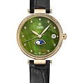Женские часы Cover Moon CO196.06 - это аксессуар для истинных леди из коллекции Fly Me To The Moon. Часы работают на кварцевом калибре ETA. Циферблат выполнен в зеленом перламутровом исполнении, создавая игру света при каждом движении запястья, и украшен 11 кристаллами Swarovski, которые служат часовым индикатором, добавляя блики света и роскоши. Кроме того, модель имеет окно фаз Луны на «6 часах» и апертуру даты на «3 часах», что делает ее функциональной для ценителей астрономических усложнений. Часы имеют 32-миллиметровый корпус из нержавеющей стали с PVD-покрытиемPVDУльтратонкое покрытие наносится в технике вакуумного напыления, сочетает в себе нитрид титана особой прочности со слоем золота или оксида хрома. Несёт в себе декоративную или защитную функцию. цвета желтого золота. Водонепроницаемость часов достигает 5 атмосфер (WR 50), что позволяет использовать их в повседневной жизни, однако не рекомендуется для контакта с водой во время плавания или дайвинга. Маркировка «Swiss Made». Кожаный ремешок на классической застежке.