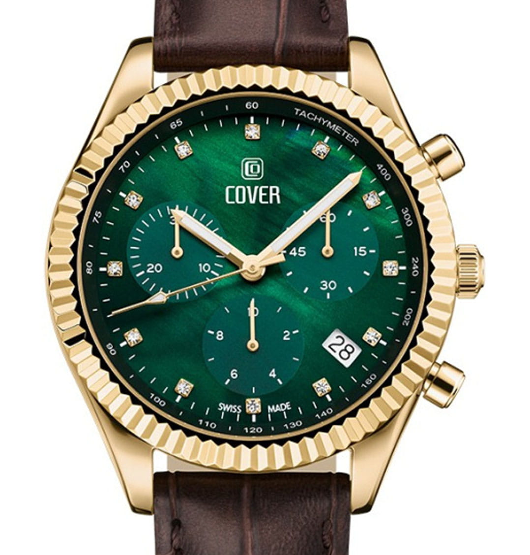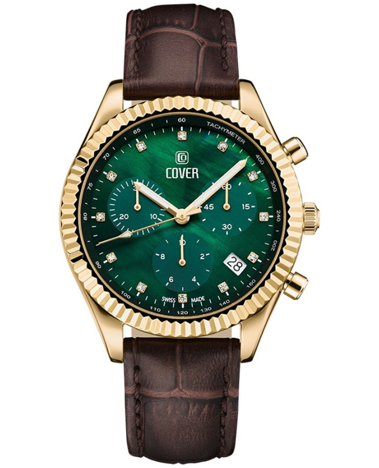 Элегантные женские часы Cover CO207.08 в спортивном стиле из коллекции Valentina Chronograph — это идеальное сочетание утонченности и функциональности. Оснащенные кварцевым механизмом с модулем хронографа Ronda 5040.D, они обеспечивают точность и надежность в каждом моменте. Зеленый перламутровый циферблат с 12 кристаллами Swarovski в роли часовых индексов придает часам изысканный вид, а три накопителя на «3», «6» и «9 часах» вместе с апертурой даты между «4» и «5 часами» добавляют функциональности. ТахиметрТахиметрРазмеченная шкала, располагается на ободке или безеле часов. Тахиметр позволяет рассчитать скорость на определённом участке пути, расстояние измеряется в километрах или милях.ическая шкала на внутреннем фланце позволяет легко отслеживать скорость, что делает эти часы не только стильными, но и практичными. Корпус диаметром 38 мм с рифленым ,безелемБезельВнешний ободок, закрепляющий стекло. В спортивных часах так называется поворотное кольцо с делениями на циферблате, выполняет роль таймера – замеряет отрезки времени на шкале. Неподвижный безель – элемент декора. Однонаправленно вращающийся безель на дайверских часах позволяет фиксировать моменты погружения и выныривания на поверхность. из нержавеющей стали с PVD-покрытиемPVDУльтратонкое покрытие наносится в технике вакуумного напыления, сочетает в себе нитрид титана особой прочности со слоем золота или оксида хрома. Несёт в себе декоративную или защитную функцию. и кожаный ремешок подчеркивают современный дизайн и комфорт при ношении. С водонепроницаемостью до 50 м и сапфировым стекломСапфировое стеклоПрочный и надёжный материал из кристалла сапфира синтетического происхождения, характеризующийся особой твёрдостью и устойчивостью к царапинам и повреждениям., эти часы идеально подходят для активных женщин. Маркировка «Swiss Made» гарантирует высокое качество и долговечность. Гарантия на изделие составляет 2 года, что подтверждает надежность и уверенность в вашем выборе. Эти часы станут не только прекрасным дополнением к вашему образу, но и верным спутником в повседневной жизни. Кожаный ремешок на классической застежке.