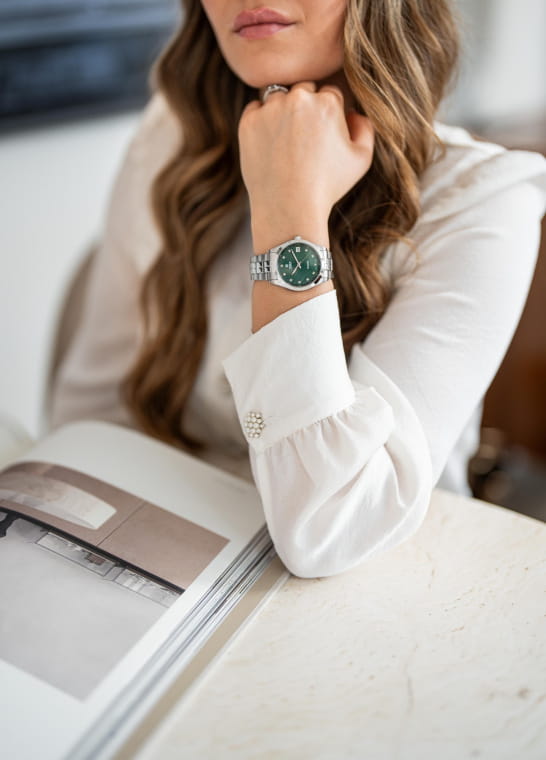 Представляем женские швейцарские часы Cover из коллекции Andara Diamond, модель CO210.03 — воплощение элегантности и роскоши. Эта уникальная модель украшена синтетическими бриллиантами, которые гармонично сочетаются с зеленым перламутровым циферблатом, создавая ослепительную игру света на запястье. Стальной корпус диаметром 35 мм выполнен в пропорциональных размерах, что делает часы удобными для повседневного ношения. Циферблат защищен прочным сапфировым стекломСапфировое стеклоПрочный и надёжный материал из кристалла сапфира синтетического происхождения, характеризующийся особой твёрдостью и устойчивостью к царапинам и повреждениям., устойчивым к царапинам и обеспечивающим идеальную читаемость времени даже при ярком свете. Модель оснащена водонепроницаемостью до 10 АТМ, что позволяет использовать часы во время плавания или занятий водными видами спорта. Однако важно помнить, что во время погружения рекомендуется не нажимать кнопки и не пользоваться заводной головкой. Стальной браслет на застёжке-бабочке с кнопкамиЗастёжка "бабочка"Такой вид застёжки дополняется предохранителями, помогающими избежать случайного раскрытия браслета. Обладают изящным исполнением. .