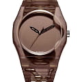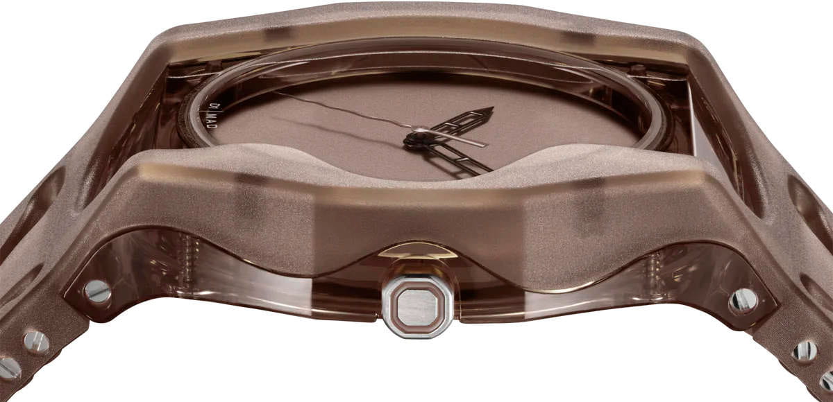 Мужские часы D1 Milano MAD Paris x D1 MDRJ06 - уникальный аксессуар.  Milano и MAD Paris представили ограниченную серию часов из шести необычных моделей, характеризующуюся яркой цветовой гаммой и монохромной эстетикой. Часы Terra имеют корпус из прозрачного нейлона, покрытого матовым полупрозрачным полиуретаном. Матовый циферблат без меток и стрелки в стиле Skeleton. Циферблат защищен минеральным стекломМинеральное стеклоМинеральное стекло представляет собой искусственно выращенный минерал кварца. Такое стекло отличается особой устойчивостью к повреждениям и царапинам. Уступает по некоторым качествам сапфировому стеклу., устойчивым к царапинам.  Секундная стрелка имеет оригинальную волнообразную форму. Задняя крышка стальная, крепится на 4 винтах, каждый экземпляр имеет индивидуальный серийный номер. Ремешок оснащен классической застежкой.