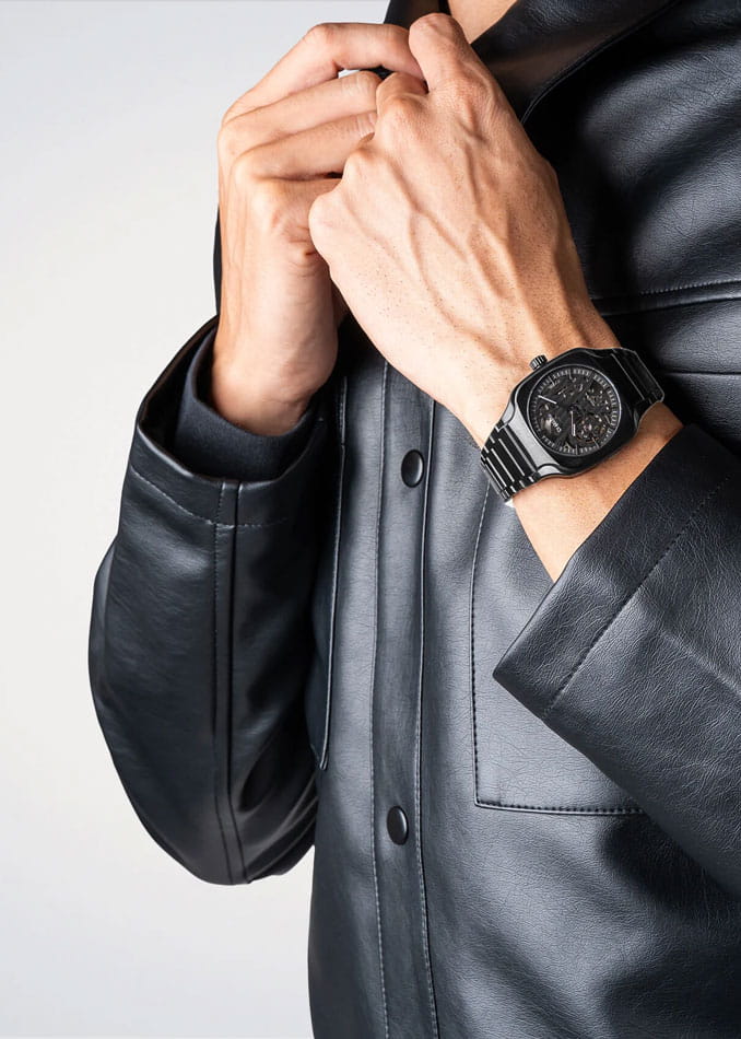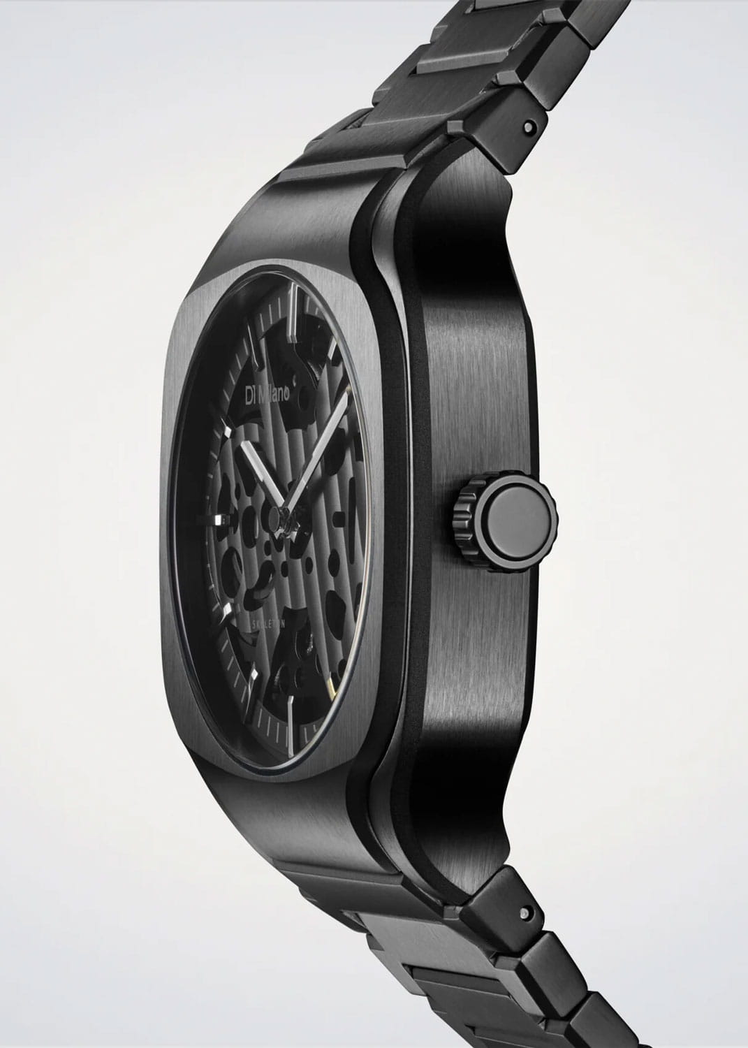 Часы D1 Milano Square SLBJ02 — это эффектные механические мужские часы, разработанные для ценителей уникальных аксессуаров. Их утонченный дизайн и высокое качество исполнения делают эти часы незаменимым элементом вашего стиля. Изготовленные в Италии, они оснащены надежным механизмом Seiko SII NH70 с автоподзаводом, обеспечивающими запас хода до 41 часа. Частота работы механизма составляет 21600 полуколебаний в час. Часы имеют корпус из нержавеющей стали с PVD-покрытиемPVDУльтратонкое покрытие наносится в технике вакуумного напыления, сочетает в себе нитрид титана особой прочности со слоем золота или оксида хрома. Несёт в себе декоративную или защитную функцию. черного цвета, размером 37х37 мм, что гарантирует долговечность и стойкость к внешним воздействиям. Скелетонизированный циферблат защищен сапфировым стекломСапфировое стеклоПрочный и надёжный материал из кристалла сапфира синтетического происхождения, характеризующийся особой твёрдостью и устойчивостью к царапинам и повреждениям. с антибликовым покрытиемАнтибликовое покрытиеСлой оксида металла в 0,13-0,3 микрон, благодаря которому стекло часов не бликует и не отражает свет. Антибликовое покрытие уменьшает отражение света в 10 раз, обеспечивая отличную читаемость показателей циферблата., подчеркивающим элегантность и изысканность модели и защищает от царапин. Стрелки с люминесцентным покрытиемЛюминесцентное покрытиеПозволяет считывать показания времени в темноте. Производители наносят на стрелки, часовые индексы, безель или поверхность циферблата светонакопительный состав, дающий холодное свечение.. Метки в виде штрихов и прозрачная задняя крышка, закрепленная на 4 винтах, придают часам особый шарм. Стальной браслет с PVD-покрытиемPVDУльтратонкое покрытие наносится в технике вакуумного напыления, сочетает в себе нитрид титана особой прочности со слоем золота или оксида хрома. Несёт в себе декоративную или защитную функцию. на застёжке-бабочкеЗастёжка "бабочка"Такой вид застёжки дополняется предохранителями, помогающими избежать случайного раскрытия браслета. Обладают изящным исполнением. обеспечивает комфортное и надежное ношение. Водозащита до 50 WR делает эти часы подходящими для повседневного использования.