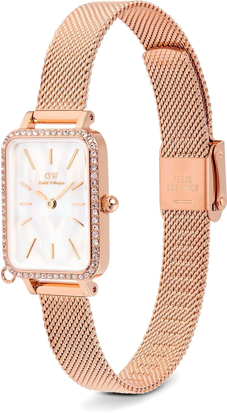 Женские наручные часы с минеральным стекломМинеральное стеклоМинеральное стекло представляет собой искусственно выращенный минерал кварца. Такое стекло отличается особой устойчивостью к повреждениям и царапинам. Уступает по некоторым качествам сапфировому стеклу. Daniel Wellington Quadro Crystal Zodiac Melrose DW00100748, кварцевый механизм с высокой точностью. Корпус часов изготовлен из нержавеющей стали с PVD-покрытиемPVDУльтратонкое покрытие наносится в технике вакуумного напыления, сочетает в себе нитрид титана особой прочности со слоем золота или оксида хрома. Несёт в себе декоративную или защитную функцию.. БезельБезельВнешний ободок, закрепляющий стекло. В спортивных часах так называется поворотное кольцо с делениями на циферблате, выполняет роль таймера – замеряет отрезки времени на шкале. Неподвижный безель – элемент декора. Однонаправленно вращающийся безель на дайверских часах позволяет фиксировать моменты погружения и выныривания на поверхность. украшен кристаллами Swarovski. Матовый циферблат украшен фирменным логотипом Daniel Wellington. Накладные метки в виде штрихов. Японский кварцевый механизм. Рифленая заводная головка. Класс водозащиты: 30 метров, позволит защитить корпус от случайных брызг или капель дождя. Стальной браслет миланского плетения с PVD-покрытиемPVDУльтратонкое покрытие наносится в технике вакуумного напыления, сочетает в себе нитрид титана особой прочности со слоем золота или оксида хрома. Несёт в себе декоративную или защитную функцию. на раскладном замкеРаскладной замокДанный вариант застежки используется только на часах с металлическим браслетом. Отличительная особенность такого крепления в том, что длина браслета становится универсальной и вы можете самостоятельно отрегулировать нужный вам размер – застежка просто двигается по браслету часов.. Корпус дополнен колечком для подвески.