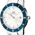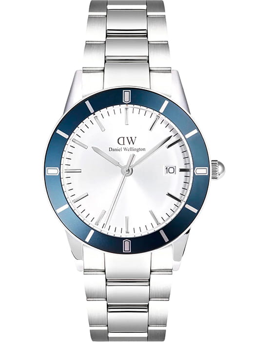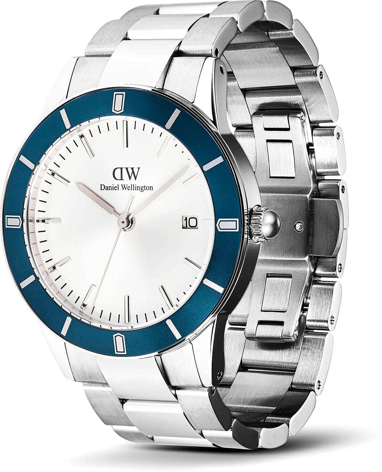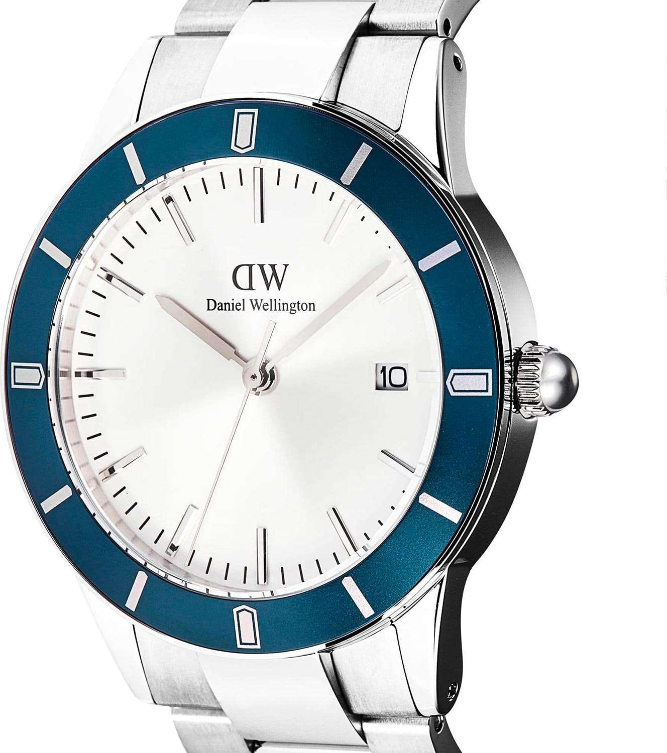Daniel Wellington — мужские часы в современном спортивно-элегантном стиле. Круглый корпус диаметром 40 мм изготовлен из нержавеющей стали и дополнен синим безелемБезельВнешний ободок, закрепляющий стекло. В спортивных часах так называется поворотное кольцо с делениями на циферблате, выполняет роль таймера – замеряет отрезки времени на шкале. Неподвижный безель – элемент декора. Однонаправленно вращающийся безель на дайверских часах позволяет фиксировать моменты погружения и выныривания на поверхность. из анодированного алюминия, которое придаёт модели выразительный характер.