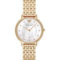 Женские кварцевые часы Emporio Armani из серии Kappa — это стильная новинка, сочетающая элегантность итальянского дизайна с надёжностью японского механизма. Корпус выполнен из нержавеющей стали с золотистым покрытием, которое реализовано по технологии PVD-покрытиеPVDУльтратонкое покрытие наносится в технике вакуумного напыления, сочетает в себе нитрид титана особой прочности со слоем золота или оксида хрома. Несёт в себе декоративную или защитную функцию.. Часы защищены минеральным стекломМинеральное стеклоМинеральное стекло представляет собой искусственно выращенный минерал кварца. Такое стекло отличается особой устойчивостью к повреждениям и царапинам. Уступает по некоторым качествам сапфировому стеклу.. Циферблат круглой формы выполнен в перламутровом цвете, придающем модели изысканный блеск, а индикация представлена золотистыми точками. Браслет из нержавеющей стали с золотистым покрытием фиксируется на застёжке «бабочка» с кнопкамиЗастёжка "бабочка"Такой вид застёжки дополняется предохранителями, помогающими избежать случайного раскрытия браслета. Обладают изящным исполнением. , обеспечивая удобство и надёжность ношения. Водонепроницаемость составляет 30 WR, что позволяет защитить часы от случайных брызг и капель дождя. Модель подчеркивает женственность и утончённый вкус владельца, идеально подходя как для повседневного, так и для вечернего образа.