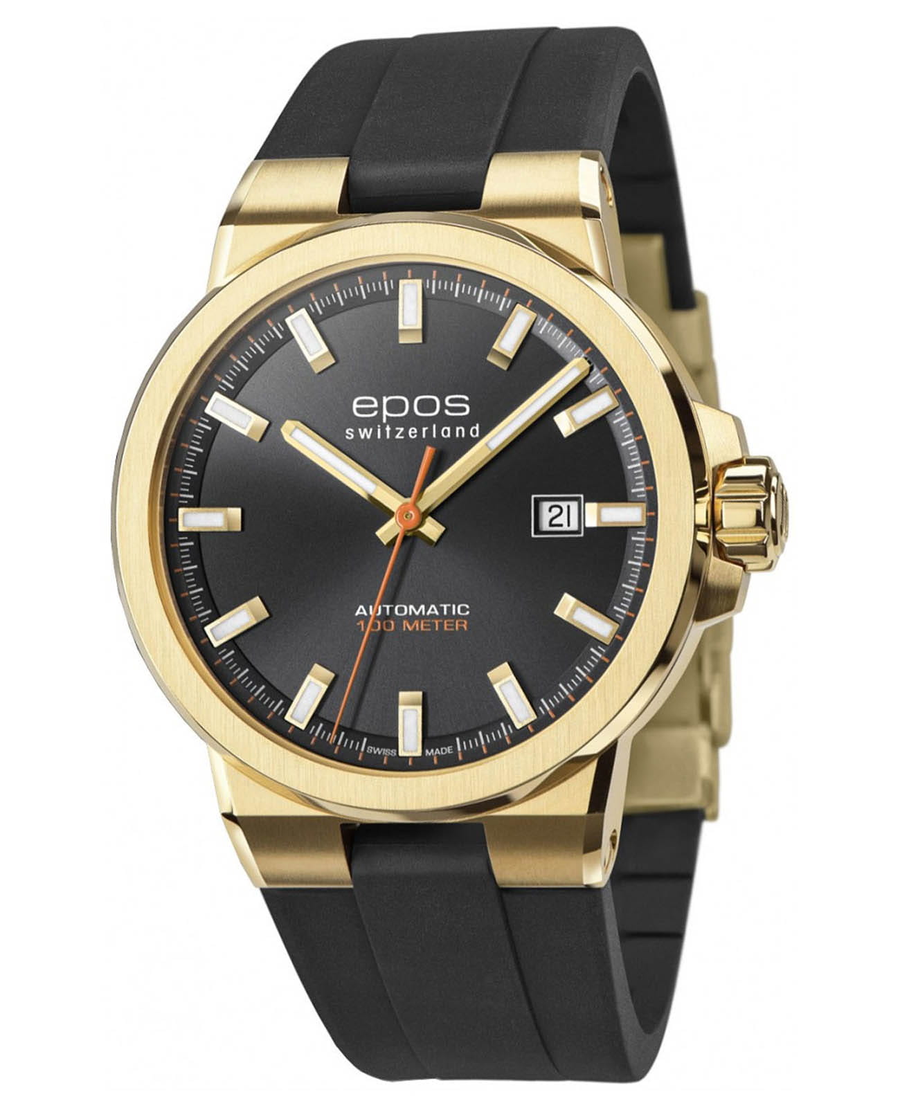 Мужские механические часы с автоподзаводом Epos из коллекции Sportive — это надёжный спортивный аксессуар с швейцарским качеством. Корпус диаметром 42 мм и толщиной 10,4 мм выполнен из нержавеющей стали 316L с PVD-покрытиемPVDУльтратонкое покрытие наносится в технике вакуумного напыления, сочетает в себе нитрид титана особой прочности со слоем золота или оксида хрома. Несёт в себе декоративную или защитную функцию.. Циферблат чёрного цвета с эффектом «солнечные лучи» оформлен аппликациями часовых индексов и крупными цифрами с покрытием цвета родия, а также яркими жёлтыми индексами, добавляющими динамики. Циферблат защищён сапфировым стекломСапфировое стеклоПрочный и надёжный материал из кристалла сапфира синтетического происхождения, характеризующийся особой твёрдостью и устойчивостью к царапинам и повреждениям.. Стрелки и метки с люминесцентным покрытиемЛюминесцентное покрытиеПозволяет считывать показания времени в темноте. Производители наносят на стрелки, часовые индексы, безель или поверхность циферблата светонакопительный состав, дающий холодное свечение. Super-Luminova, обеспечивающим отличную читаемость в темноте. Механизм — швейцарский калибр ETA 2824 с запасом хода 38 часов, декорированный узором «Côtes de Genève». Прозрачная задняя крышка позволяет наблюдать за работой механизма. Завинчивающаяся коронка обеспечивает дополнительную защиту. Часы оснащены каучуковым ремешком чёрного цвета с тиснением и раскладной застёжкойРаскладная застёжкаТакой тип застёжки используется только на браслетах из металла. Она никогда не раскрывается полностью, происходит разделение на 2 и более частей. Раскладывающая застёжка снизит вероятность потери часов к минимуму. с двойной блокировкой и защитным фиксатором. Водонепроницаемость 100 м позволяет использовать часы для плавания и других водных видов спорта. Гарантия — 24 месяца. Универсальный выбор для тех, кто ценит стиль, прочность и точность.