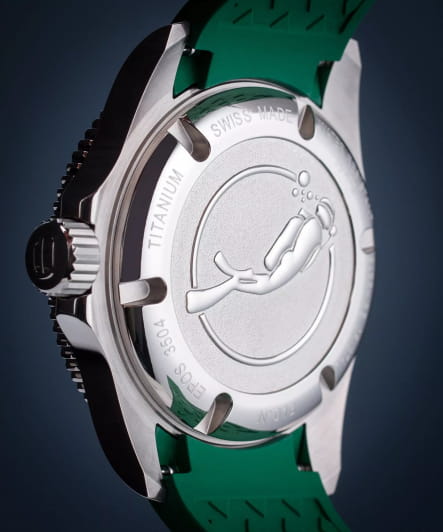 Мужские механические часы с автоподзаводом — это профессиональный дайверский инструмент с швейцарским качеством. Корпус диаметром 41,5 мм и толщиной 13,3 мм выполнен из титана с PVD-покрытиемPVDУльтратонкое покрытие наносится в технике вакуумного напыления, сочетает в себе нитрид титана особой прочности со слоем золота или оксида хрома. Несёт в себе декоративную или защитную функцию., что обеспечивает лёгкость и высокую прочность. Циферблат зелёного цвета оформлен контрастными метками и стрелками. Циферблат защищён сапфировым стекломСапфировое стеклоПрочный и надёжный материал из кристалла сапфира синтетического происхождения, характеризующийся особой твёрдостью и устойчивостью к царапинам и повреждениям.. Механизм — швейцарский калибр Sellita SW200. Окошко даты расположено в положении 3 часов. БезельБезельВнешний ободок, закрепляющий стекло. В спортивных часах так называется поворотное кольцо с делениями на циферблате, выполняет роль таймера – замеряет отрезки времени на шкале. Неподвижный безель – элемент декора. Однонаправленно вращающийся безель на дайверских часах позволяет фиксировать моменты погружения и выныривания на поверхность. — однонаправленный вращающийся. Завинчивающаяся коронка и автоматический гелиевый клапан позволяют использовать часы при глубоководных погружениях. Часы оснащены каучуковым ремешком зелёного цвета с стандартной застёжкой. Водонепроницаемость 500 м соответствует требованиям для профессионального дайвинга. Вес — 98 г. Гарантия — 24 месяца. Идеальный выбор для тех, кто ценит надёжность, точность и экстремальные условия.