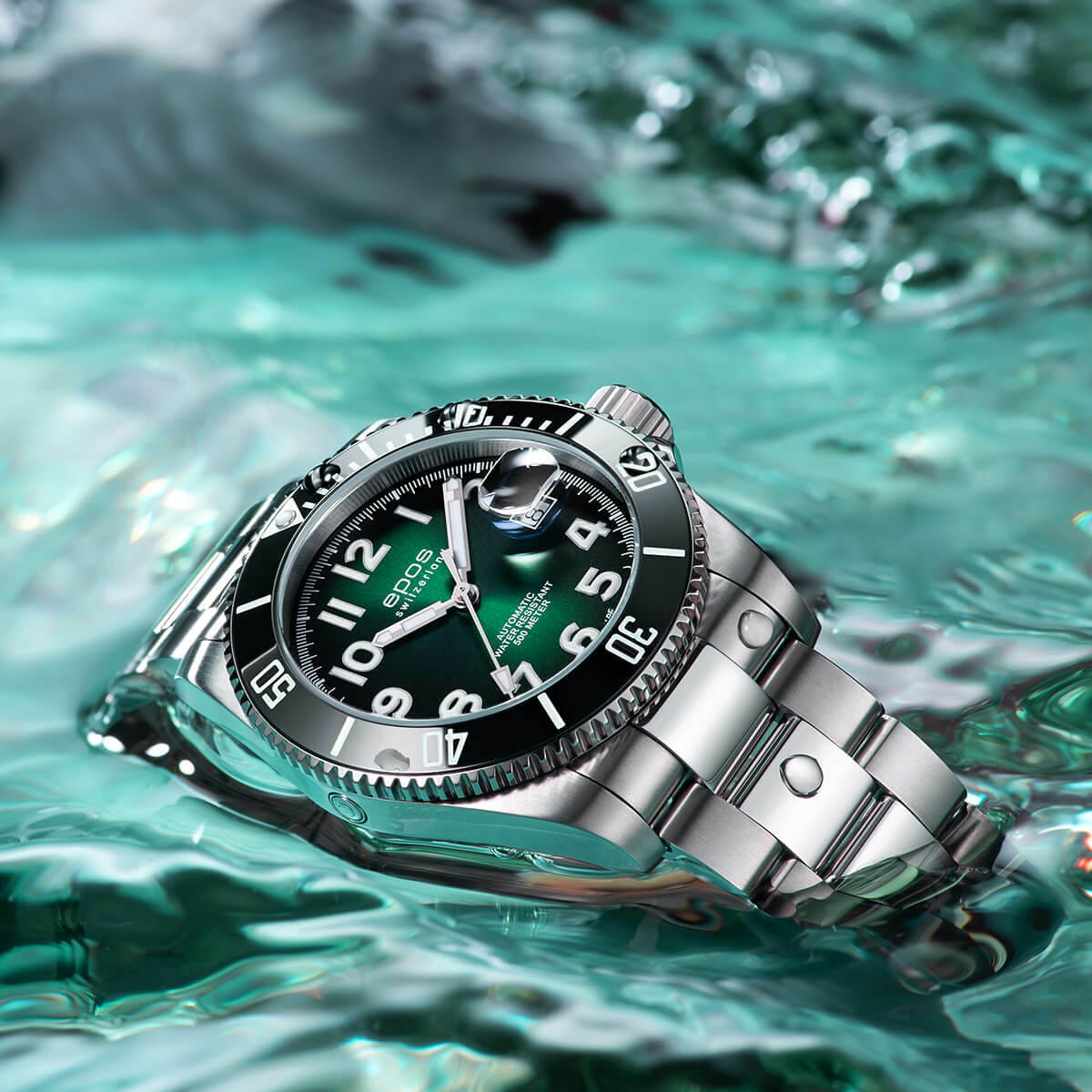 Мужские механические часы с автоподзаводом Epos — это профессиональный дайверский инструмент с швейцарским качеством. Корпус диаметром 41,5 мм и толщиной 13,3 мм выполнен из титана, что обеспечивает лёгкость и высокую прочность. Циферблат зелёного цвета оформлен контрастными метками и стрелками. Циферблат защищён сапфировым стекломСапфировое стеклоПрочный и надёжный материал из кристалла сапфира синтетического происхождения, характеризующийся особой твёрдостью и устойчивостью к царапинам и повреждениям.. Механизм — швейцарский калибр Sellita SW200. Окошко даты расположено в положении 3 часов. БезельБезельВнешний ободок, закрепляющий стекло. В спортивных часах так называется поворотное кольцо с делениями на циферблате, выполняет роль таймера – замеряет отрезки времени на шкале. Неподвижный безель – элемент декора. Однонаправленно вращающийся безель на дайверских часах позволяет фиксировать моменты погружения и выныривания на поверхность. — однонаправленный вращающийся. Завинчивающаяся коронка и автоматический гелиевый клапан позволяют использовать часы при глубоководных погружениях. Часы оснащены титановым браслетом на раскладной застёжкеРаскладная застёжкаТакой тип застёжки используется только на браслетах из металла. Она никогда не раскрывается полностью, происходит разделение на 2 и более частей. Раскладывающая застёжка снизит вероятность потери часов к минимуму.. Водонепроницаемость 500 м соответствует требованиям для профессионального дайвинга. Гарантия — 24 месяца. Идеальный выбор для тех, кто ценит надёжность, точность и экстремальные условия.