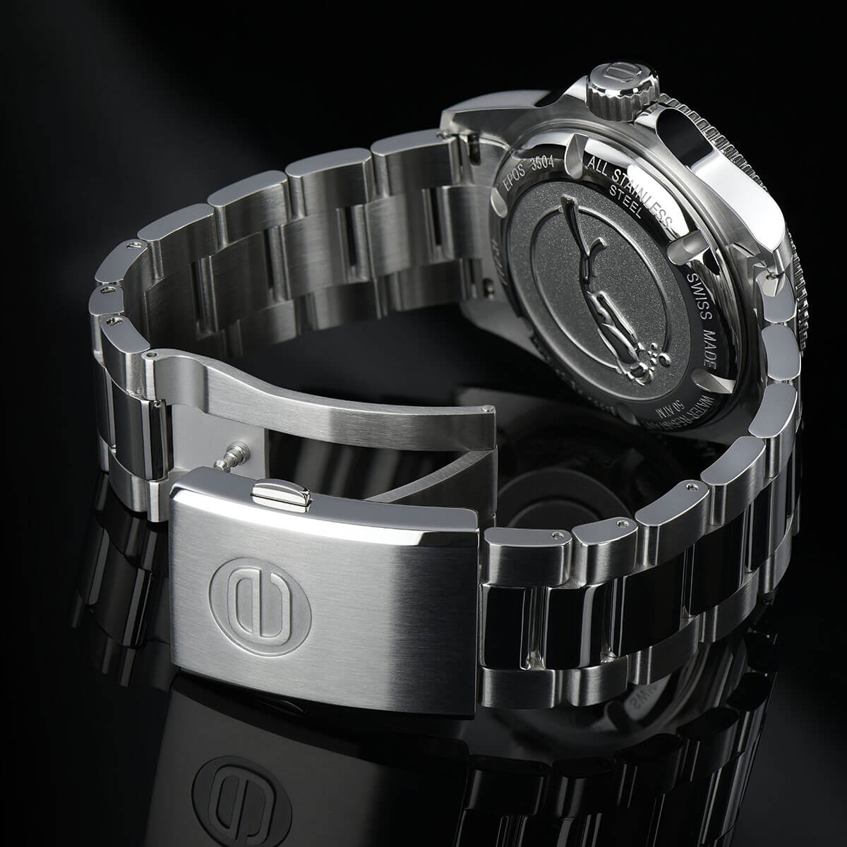 Мужские швейцарские механические часы с автоподзаводом Epos Diver 3504.131.93.13.30. Сапфировое стеклоСапфировое стеклоПрочный и надёжный материал из кристалла сапфира синтетического происхождения, характеризующийся особой твёрдостью и устойчивостью к царапинам и повреждениям. устойчивое к появлению царапин, обладающее высокой прозрачностью. Корпус и браслет часов изготовлен из нержавеющей стали. Врачающийся в одном направлении безельБезельВнешний ободок, закрепляющий стекло. В спортивных часах так называется поворотное кольцо с делениями на циферблате, выполняет роль таймера – замеряет отрезки времени на шкале. Неподвижный безель – элемент декора. Однонаправленно вращающийся безель на дайверских часах позволяет фиксировать моменты погружения и выныривания на поверхность. из нержавеющей стали с PVDPVDУльтратонкое покрытие наносится в технике вакуумного напыления, сочетает в себе нитрид титана особой прочности со слоем золота или оксида хрома. Несёт в себе декоративную или защитную функцию. покрытием. Лупа над окошком даты. Прозрачная задняя крышка. Завинчивающаяся заводная головка. Класс водозащиты: 500 метров, позволит плавать, нырять и заниматься другими водными видами спорта. Стальной браслет на раскладной застёжкеРаскладная застёжкаТакой тип застёжки используется только на браслетах из металла. Она никогда не раскрывается полностью, происходит разделение на 2 и более частей. Раскладывающая застёжка снизит вероятность потери часов к минимуму..
