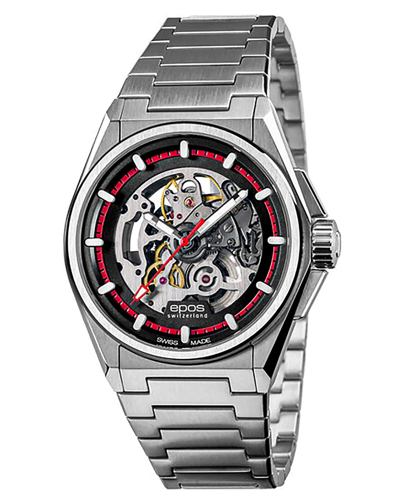 Мужские механические часы с автоподзаводом Epos из коллекции Sportive — это стильный и технологичный аксессуар с швейцарским качеством. Корпус диаметром 41 мм и толщиной 11 мм выполнен из нержавеющей стали 316L. Циферблат чёрного цвета с красными и серыми акцентами частично скелетонизирован, что позволяет наблюдать за работой механизма. Циферблат защищён сапфировым стекломСапфировое стеклоПрочный и надёжный материал из кристалла сапфира синтетического происхождения, характеризующийся особой твёрдостью и устойчивостью к царапинам и повреждениям.. Механизм — швейцарский калибр Sellita SW200 с запасом хода 38 часов. Завинчивающаяся коронка обеспечивает дополнительную защиту. Прозрачная задняя крышка открывает вид на декорированный механизм. Часы оснащены стальным браслетом на раскладной застёжкеРаскладная застёжкаТакой тип застёжки используется только на браслетах из металла. Она никогда не раскрывается полностью, происходит разделение на 2 и более частей. Раскладывающая застёжка снизит вероятность потери часов к минимуму.. Водонепроницаемость 100 м позволяет использовать часы для плавания и повседневного ношения. Гарантия — 24 месяца. Универсальный выбор для ценителя механики и современного дизайна.