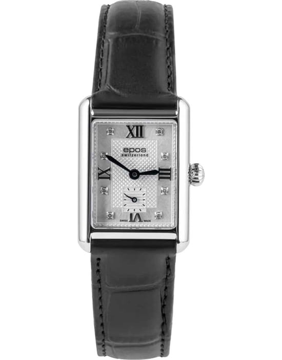 Epos 8002.702.20.80.15 — женская модель с утончённым классическим стилем и прямоугольным корпусом, выполненным из нержавеющей стали. Белый циферблат оформлен римскими индексами и утончённым узором «Clous de Paris», создающим игру света и подчёркивающим глубину дизайна. Защитную функцию выполняет сапфировое стеклоСапфировое стеклоПрочный и надёжный материал из кристалла сапфира синтетического происхождения, характеризующийся особой твёрдостью и устойчивостью к царапинам и повреждениям., стойкое к царапинам и сохраняющее прозрачность и украшен бриллиантами. В основе лежит швейцарский автоматический механизм, обеспечивающий стабильность и точность хода. Функции включают индикацию часов, минут и малую секундную шкалу, расположенную в позиции «6 часов». Часы дополнены кожаным ремешком классического чёрного цвета, который гармонично завершает строгий образ модели.