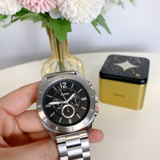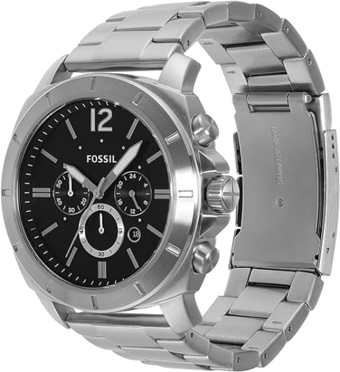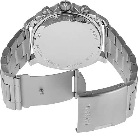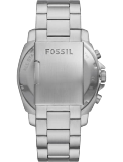 Мужские наручные часы-хронографХронографФункция позволяет измерять отрезки времени с особой точностью: часы, минуты, секунды. Верным признаком хронографа является наличие на циферблате 3 дополнительных окошек-счётчиков. с минеральным стекломМинеральное стеклоМинеральное стекло представляет собой искусственно выращенный минерал кварца. Такое стекло отличается особой устойчивостью к повреждениям и царапинам. Уступает по некоторым качествам сапфировому стеклу. Fossil Privateer BQ2757, кварцевый механизм с высокой точностью. Класс водозащиты: 50 метров, позволит защитить корпус от случайных брызг или капель дождя. Корпус часов изготовлен из стали. Стальной браслет на раскладной застёжкеРаскладная застёжкаТакой тип застёжки используется только на браслетах из металла. Она никогда не раскрывается полностью, происходит разделение на 2 и более частей. Раскладывающая застёжка снизит вероятность потери часов к минимуму.. Стрелки и метки с люминесцентным покрытиемЛюминесцентное покрытиеПозволяет считывать показания времени в темноте. Производители наносят на стрелки, часовые индексы, безель или поверхность циферблата светонакопительный состав, дающий холодное свечение.. Окошко даты расположено между 4-мя и 5-ю часами.