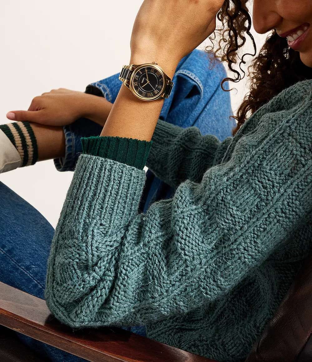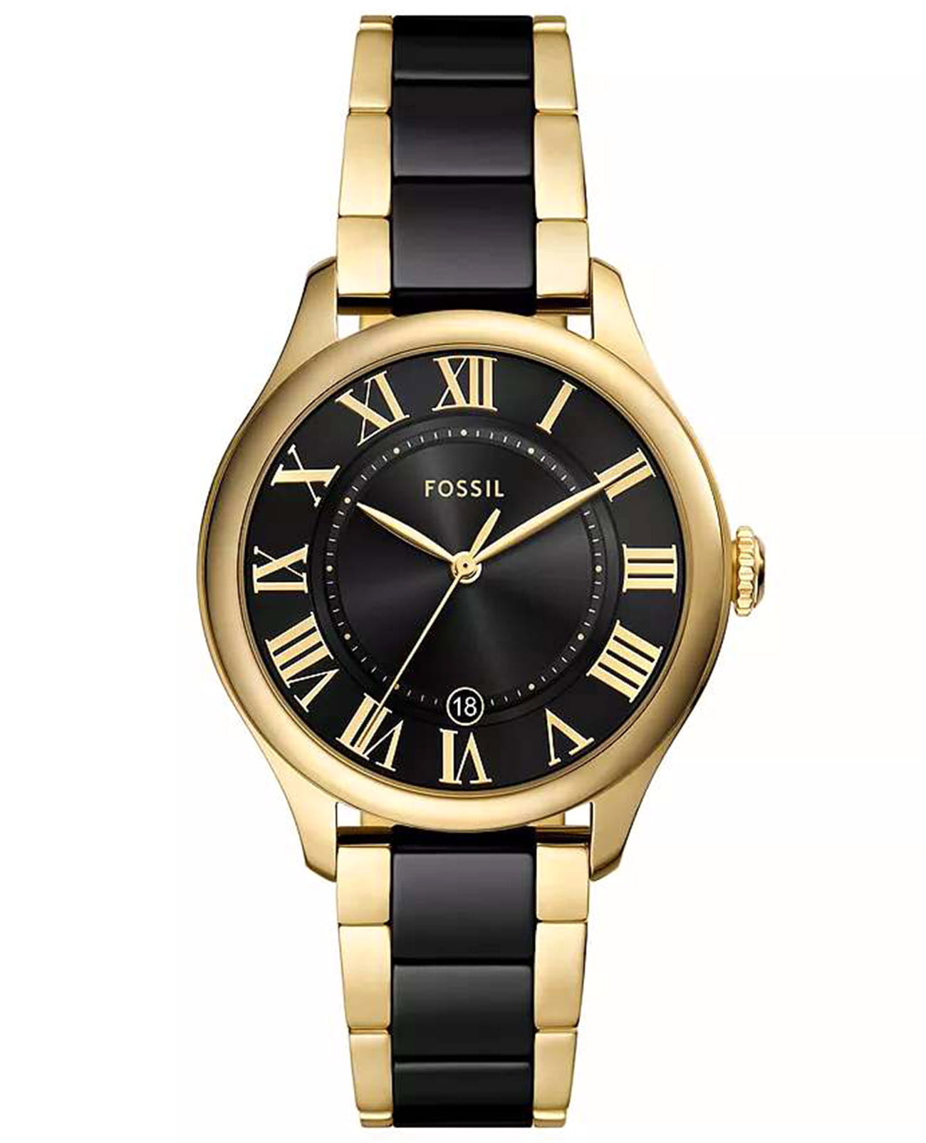 Женские кварцевые часы Fossil — это элегантный аксессуар, сочетающий стиль и надежность. Модель CE1132 выполнена в круглом корпусе диаметром 38 мм из нержавеющей стали с IP-покрытиемIP-покрытиеМетод ионного напыления. Демонстрирует повышенную устойчивость к истиранию, окислению и химическим веществам. Под воздействием высокого давления и температуры около 1500°C молекулы металла надёжно соединяются с частицами корпуса часов. цвета жёлтого золота. Циферблат чёрного цвета оформлен индексами и стрелками. Окошко даты расположено в положении 6 часов. Циферблат защищён минеральным стекломМинеральное стеклоМинеральное стекло представляет собой искусственно выращенный минерал кварца. Такое стекло отличается особой устойчивостью к повреждениям и царапинам. Уступает по некоторым качествам сапфировому стеклу.. Часы оснащены браслетом из керамики и стали с IP-покрытиемIP-покрытиеМетод ионного напыления. Демонстрирует повышенную устойчивость к истиранию, окислению и химическим веществам. Под воздействием высокого давления и температуры около 1500°C молекулы металла надёжно соединяются с частицами корпуса часов. на застёжке «бабочка» с кнопкамиЗастёжка "бабочка"Такой вид застёжки дополняется предохранителями, помогающими избежать случайного раскрытия браслета. Обладают изящным исполнением. . Водонепроницаемость 50 м позволяет использовать часы для плавания и повседневного ношения. Идеальный выбор для тех, кто ценит американское качество и безупречный дизайн.