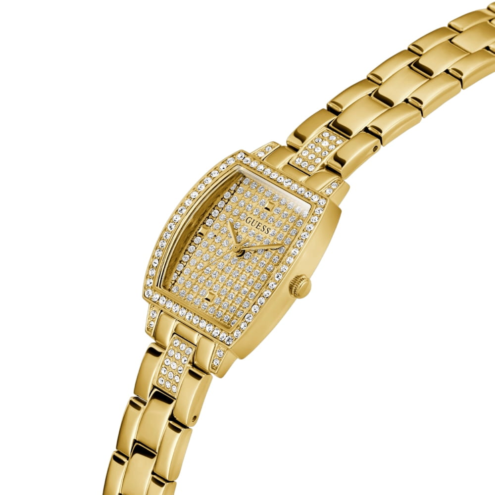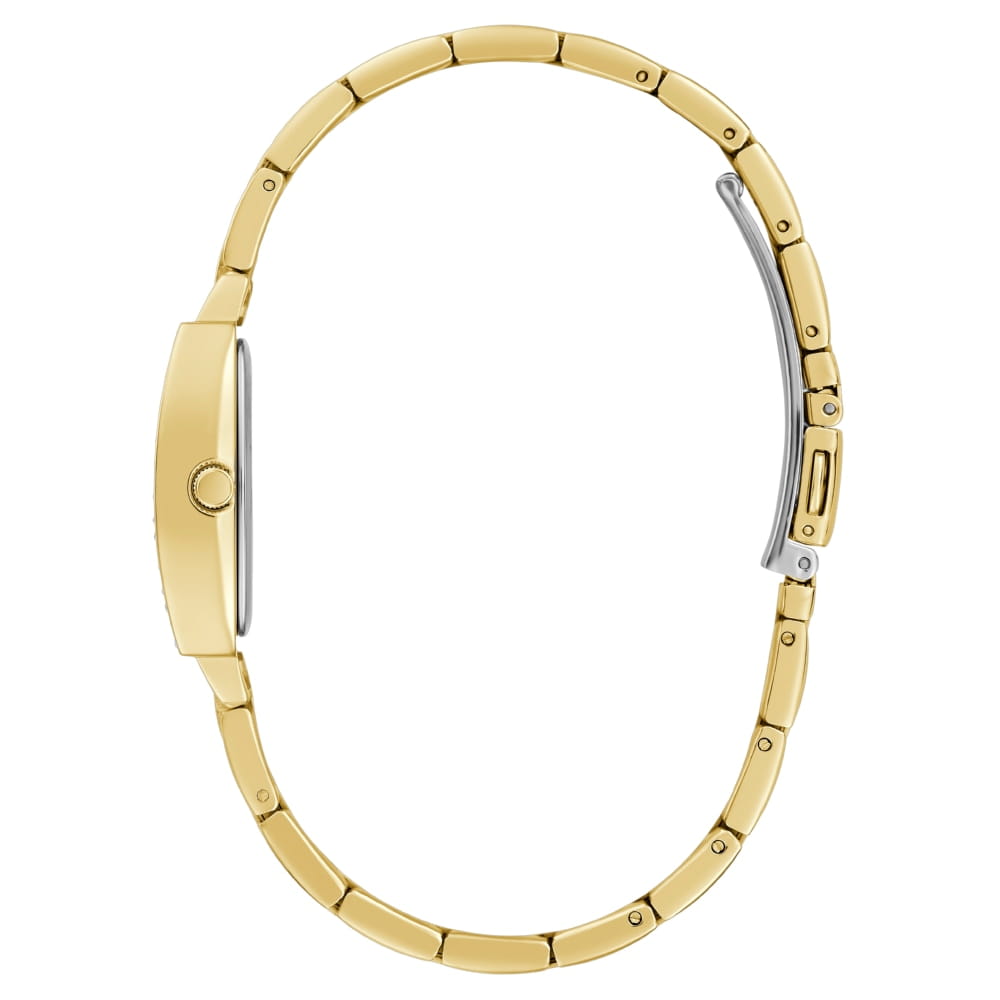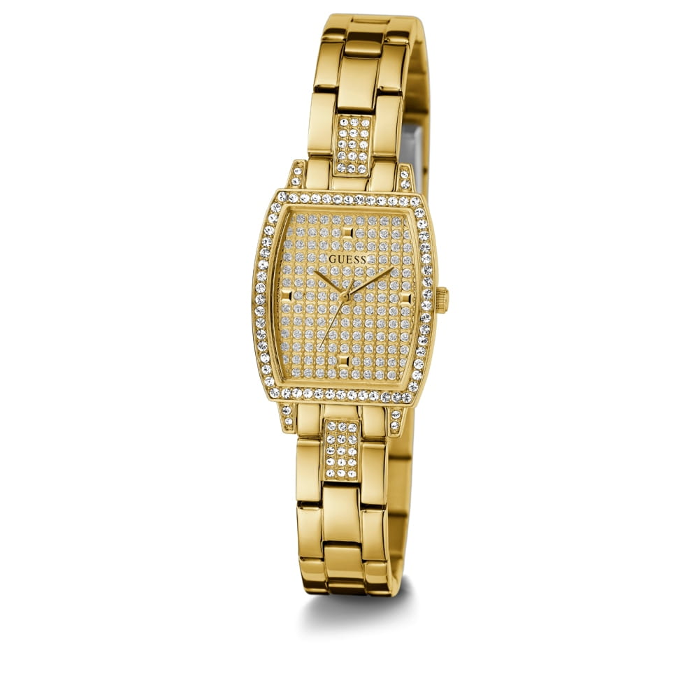 Женские наручные часы с минеральным стекломМинеральное стеклоМинеральное стекло представляет собой искусственно выращенный минерал кварца. Такое стекло отличается особой устойчивостью к повреждениям и царапинам. Уступает по некоторым качествам сапфировому стеклу. Guess Briljant GW0611L2, кварцевый механизм с высокой точностью. Класс водозащиты: 30 метров, позволит защитить корпус от случайных брызг или капель дождя. Корпус часов изготовлен из стали с IP-покрытиемIP-покрытиеМетод ионного напыления. Демонстрирует повышенную устойчивость к истиранию, окислению и химическим веществам. Под воздействием высокого давления и температуры около 1500°C молекулы металла надёжно соединяются с частицами корпуса часов.. Стальной браслет на раскладной застёжкеРаскладная застёжкаТакой тип застёжки используется только на браслетах из металла. Она никогда не раскрывается полностью, происходит разделение на 2 и более частей. Раскладывающая застёжка снизит вероятность потери часов к минимуму. с IP-покрытиемIP-покрытиеМетод ионного напыления. Демонстрирует повышенную устойчивость к истиранию, окислению и химическим веществам. Под воздействием высокого давления и температуры около 1500°C молекулы металла надёжно соединяются с частицами корпуса часов.. Циферблат, корпус и браслет украшены паве из кристаллов. Метки в виде точек.