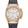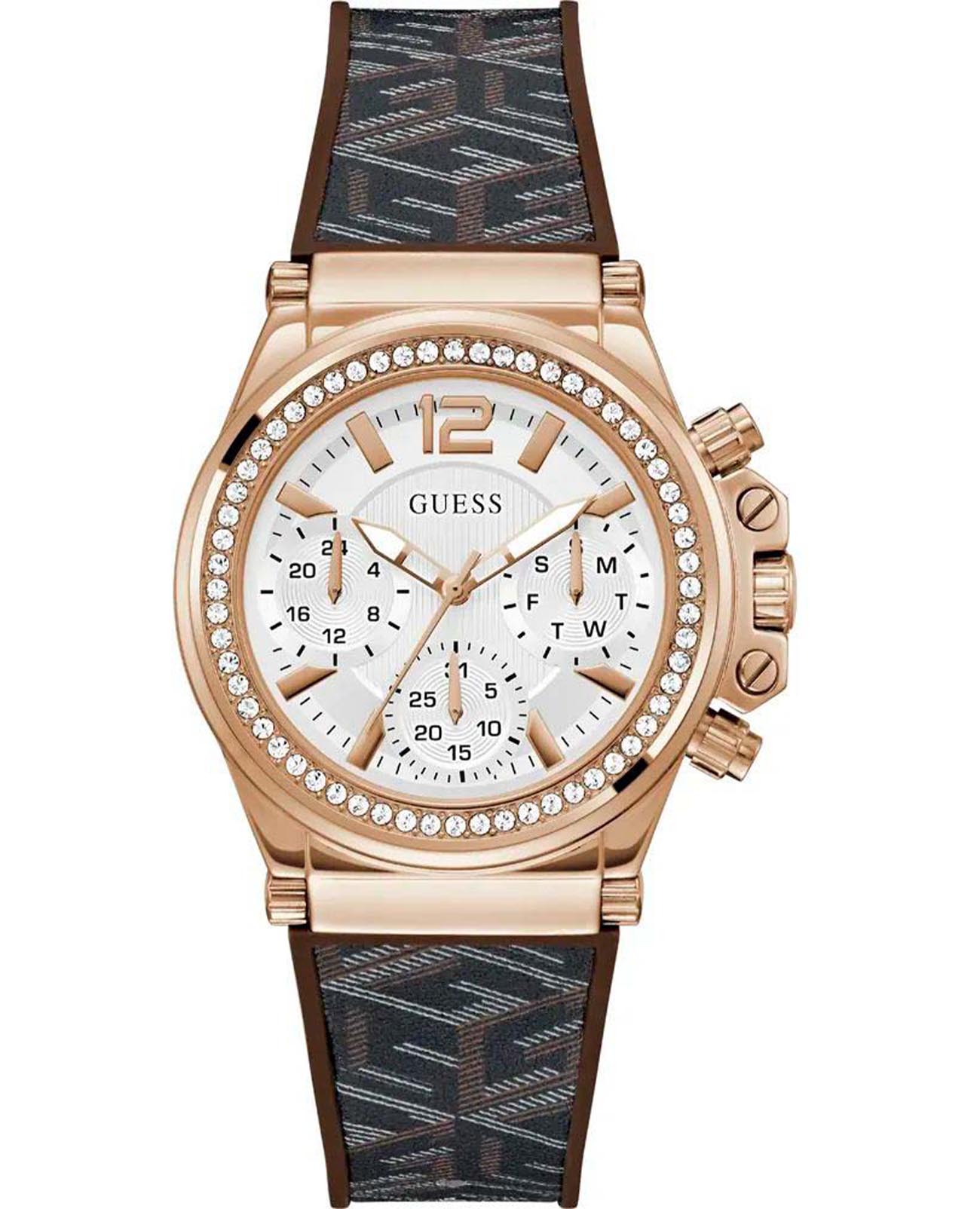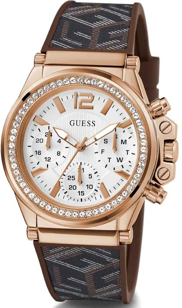 Женские наручные часы с минеральным стекломМинеральное стеклоМинеральное стекло представляет собой искусственно выращенный минерал кварца. Такое стекло отличается особой устойчивостью к повреждениям и царапинам. Уступает по некоторым качествам сапфировому стеклу. Guess Charisma GW0621L5, кварцевый механизм с высокой точностью. Класс водозащиты: 30 метров, позволит защитить корпус от случайных брызг или капель дождя. Корпус часов изготовлен из стали с IP-покрытиемIP-покрытиеМетод ионного напыления. Демонстрирует повышенную устойчивость к истиранию, окислению и химическим веществам. Под воздействием высокого давления и температуры около 1500°C молекулы металла надёжно соединяются с частицами корпуса часов.. Силиконовый ремешок на стандартной застёжке. Стрелки с люминесцентным покрытиемЛюминесцентное покрытиеПозволяет считывать показания времени в темноте. Производители наносят на стрелки, часовые индексы, безель или поверхность циферблата светонакопительный состав, дающий холодное свечение..