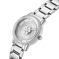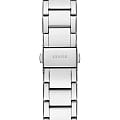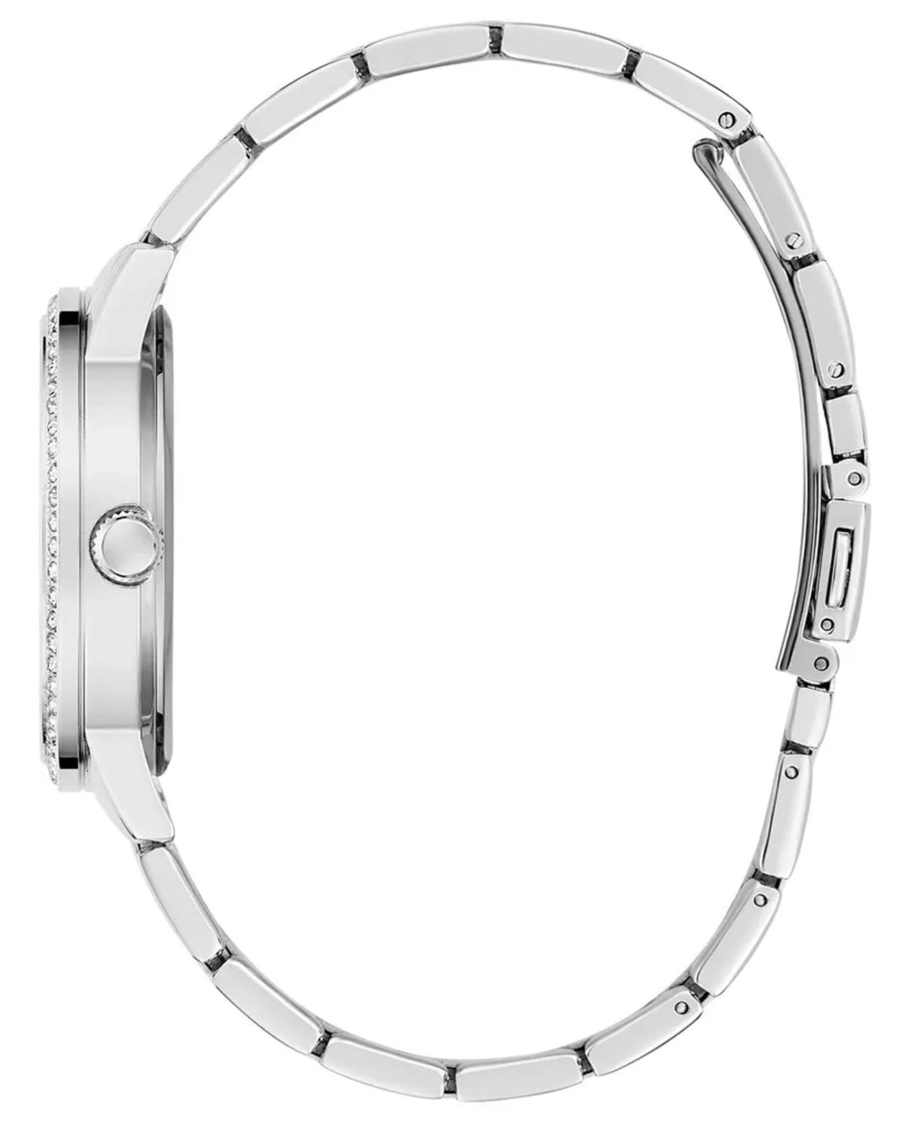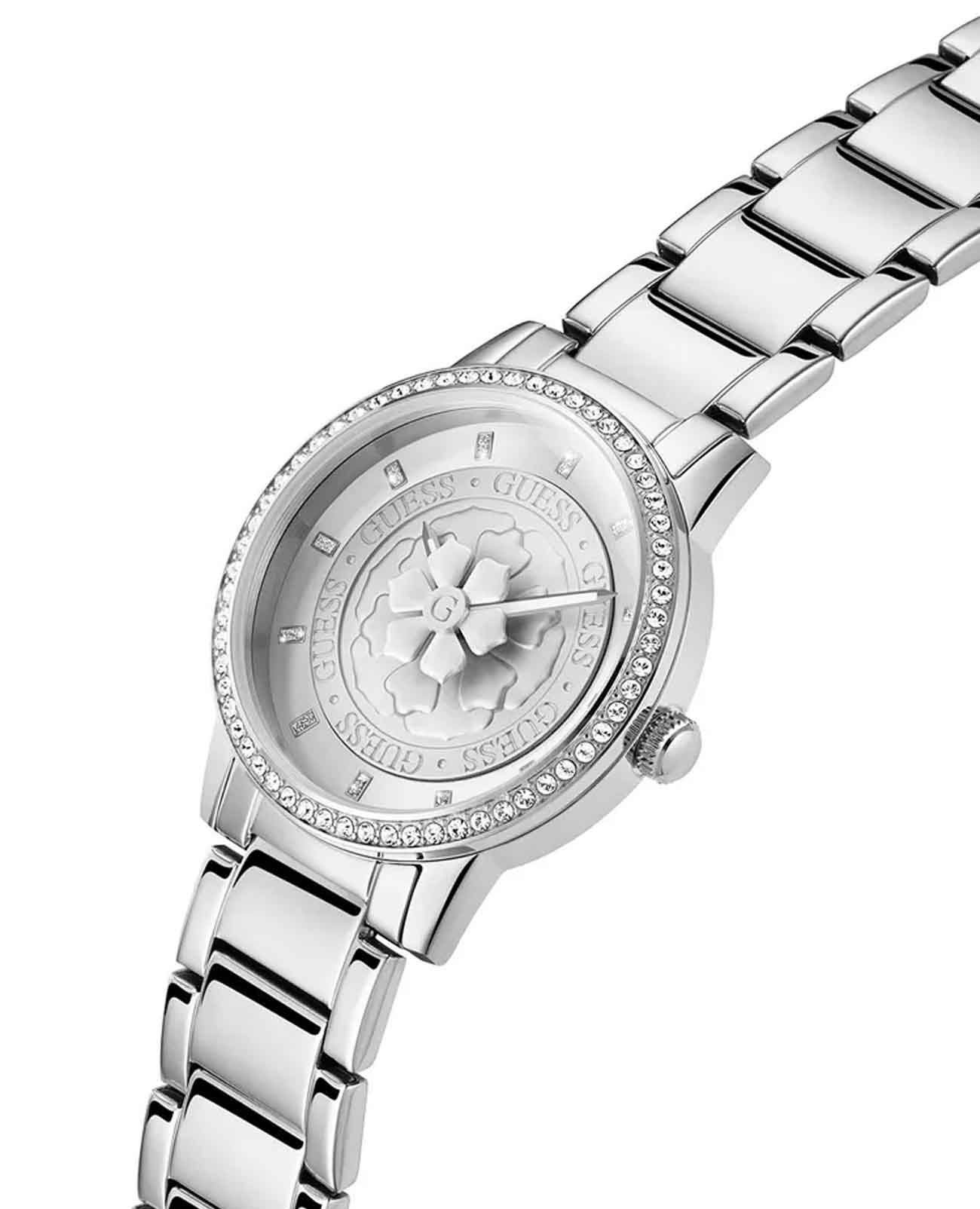 Женские наручные часы с минеральным стекломМинеральное стеклоМинеральное стекло представляет собой искусственно выращенный минерал кварца. Такое стекло отличается особой устойчивостью к повреждениям и царапинам. Уступает по некоторым качествам сапфировому стеклу. Guess Trend GW0747L1, кварцевый механизм с высокой точностью. Корпус часов изготовлен из стали. БезельБезельВнешний ободок, закрепляющий стекло. В спортивных часах так называется поворотное кольцо с делениями на циферблате, выполняет роль таймера – замеряет отрезки времени на шкале. Неподвижный безель – элемент декора. Однонаправленно вращающийся безель на дайверских часах позволяет фиксировать моменты погружения и выныривания на поверхность. и циферблат украшены кристаллами. Класс водозащиты: 30 метров, позволит защитить корпус от случайных брызг или капель дождя. Стальной браслет на раскладной застёжкеРаскладная застёжкаТакой тип застёжки используется только на браслетах из металла. Она никогда не раскрывается полностью, происходит разделение на 2 и более частей. Раскладывающая застёжка снизит вероятность потери часов к минимуму..