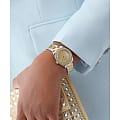 Эти элегантные часы Guess GW0841L2 станут идеальным дополнением для тех, кто стремится подчеркнуть свой стиль и уверенность. Оснащенные надежным кварцевым механизмом, они обеспечивают точность и долговечность. Круглый стальной корпус с полированной поверхностью придает часам современный и изысканный вид. БезельБезельВнешний ободок, закрепляющий стекло. В спортивных часах так называется поворотное кольцо с делениями на циферблате, выполняет роль таймера – замеряет отрезки времени на шкале. Неподвижный безель – элемент декора. Однонаправленно вращающийся безель на дайверских часах позволяет фиксировать моменты погружения и выныривания на поверхность. с золотистым IP-покрытиемIP-покрытиеМетод ионного напыления. Демонстрирует повышенную устойчивость к истиранию, окислению и химическим веществам. Под воздействием высокого давления и температуры около 1500°C молекулы металла надёжно соединяются с частицами корпуса часов. украшен кристаллами, добавляющими дополнительный блеск и роскошь. Золотистый циферблат, выполненный по технологии Sunray, притягивает взгляды своим изысканным сиянием. Метки на циферблате представлены в виде штрихов и римских цифр, что подчеркивает классический стиль аксессуара. Люминесцентное покрытиеЛюминесцентное покрытиеПозволяет считывать показания времени в темноте. Производители наносят на стрелки, часовые индексы, безель или поверхность циферблата светонакопительный состав, дающий холодное свечение. на стрелках обеспечивает отличную видимость в темноте. Рифленая заводная головка обеспечивает удобство в настройке времени. Стальной браслет с частичным золотистым IP-покрытиемIP-покрытиеМетод ионного напыления. Демонстрирует повышенную устойчивость к истиранию, окислению и химическим веществам. Под воздействием высокого давления и температуры около 1500°C молекулы металла надёжно соединяются с частицами корпуса часов. и с раскладной застежкойРаскладная застёжкаТакой тип застёжки используется только на браслетах из металла. Она никогда не раскрывается полностью, происходит разделение на 2 и более частей. Раскладывающая застёжка снизит вероятность потери часов к минимуму. гарантирует комфортное ношение и надежную фиксацию на запястье. Часы обладают водозащитой 30WR, что делает их устойчивыми к случайным брызгам. Минеральное стеклоМинеральное стеклоМинеральное стекло представляет собой искусственно выращенный минерал кварца. Такое стекло отличается особой устойчивостью к повреждениям и царапинам. Уступает по некоторым качествам сапфировому стеклу. защищает циферблат от царапин и других повреждений.
