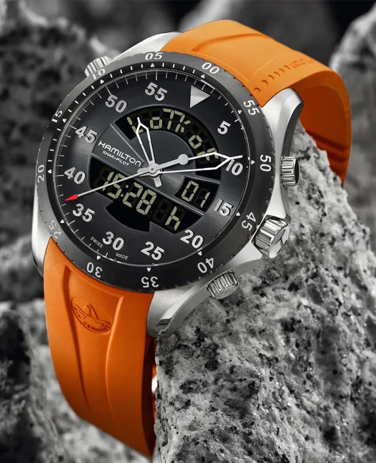 Цифровые и аналоговые дисплеи достигают новых высот благодаря Hamilton Khaki Aviation Flight Timer Quartz, сложным многофункциональным авиационным часам, которые включают в себя специальный бортовой журнал пилота для записи подробностей до 20 полетов и для каждого из них 99 посадок. Часы обладают широким спектром практичных и динамичных функций, таких как: два цифровых часовых пояса, время UTCUTCВсемирное кординационное время, не имеющее привязки к географическому положению Гринвича, основывается на атомном отсчёте времени. Регулировка времени осуществляется более точно, чем устаревшее GMT.