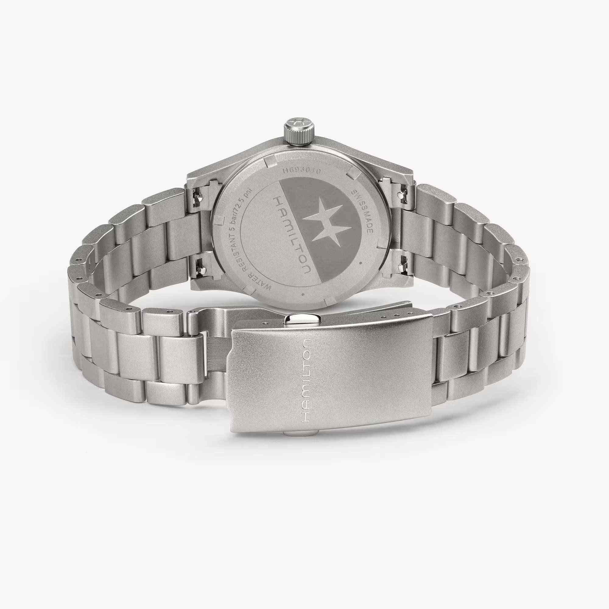Hamilton Khaki Field Quartz 33mm H69301130 — компактные и универсальные часы в классическом военном стиле, с акцентом на надёжность и практичность. Изысканный корпус диаметром 33 мм выполнен из нержавеющей стали, лёгкий, удобный и идеально подходит для запястий любого размера. Циферблат защищён сапфировым стекломСапфировое стеклоПрочный и надёжный материал из кристалла сапфира синтетического происхождения, характеризующийся особой твёрдостью и устойчивостью к царапинам и повреждениям., устойчивым к царапинам и бликам. Циферблат оформлен в классическом армейском стиле: крупные арабские цифры, стрелки и метки с люминесцентным покрытиемЛюминесцентное покрытиеПозволяет считывать показания времени в темноте. Производители наносят на стрелки, часовые индексы, безель или поверхность циферблата светонакопительный состав, дающий холодное свечение. Super-LumiNova®, обеспечивающим превосходную видимость в темноте. Внутри установлен швейцарский кварцевый калибр ETA F05.105mh2. Модель укомплектована браслетом из нержавеющей стали с раскладной застёжкойРаскладная застёжкаТакой тип застёжки используется только на браслетах из металла. Она никогда не раскрывается полностью, происходит разделение на 2 и более частей. Раскладывающая застёжка снизит вероятность потери часов к минимуму., обеспечивающей надёжную посадку. Водонепроницаемость 50 метров делает часы устойчивыми к брызгам и дождю, идеально подходящими для повседневного ношения. Khaki Field Quartz 33 мм — надёжный выбор для тех, кто ценит простоту, точность и долговечность.