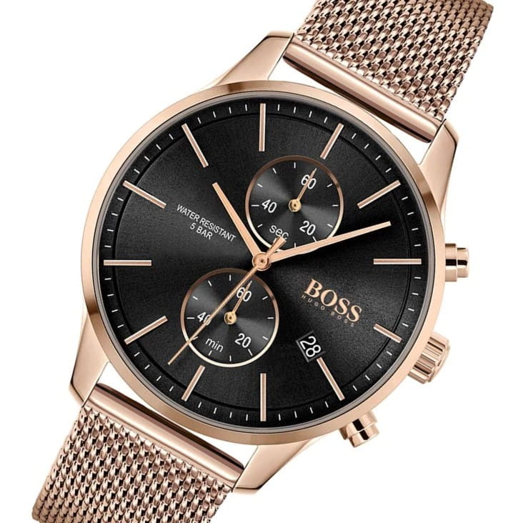 Мужские часы Hugo Boss Associate HB1513806 представлены в круглом 42-мм корпусе из нержавеющей стали 316L с золотистым PVD-покрытиемPVDУльтратонкое покрытие наносится в технике вакуумного напыления, сочетает в себе нитрид титана особой прочности со слоем золота или оксида хрома. Несёт в себе декоративную или защитную функцию.. Оснащены кварцевым механизмом с функциями хронографаХронографФункция позволяет измерять отрезки времени с особой точностью: часы, минуты, секунды. Верным признаком хронографа является наличие на циферблате 3 дополнительных окошек-счётчиков., секундомеромСекундомерСекундоме́р — прибор, способный измерять интервалы времени с точностью до долей секунды. и индикацией даты на позиции 4 часа. Циферблат с подсветкой стрелок защищен устойчивым к царапинам минеральным стекломМинеральное стеклоМинеральное стекло представляет собой искусственно выращенный минерал кварца. Такое стекло отличается особой устойчивостью к повреждениям и царапинам. Уступает по некоторым качествам сапфировому стеклу.. Стальной браслет дополнен раскладной застёжкойРаскладная застёжкаТакой тип застёжки используется только на браслетах из металла. Она никогда не раскрывается полностью, происходит разделение на 2 и более частей. Раскладывающая застёжка снизит вероятность потери часов к минимуму. с фиксатором для надежной посадки. Водонепроницаемость 50 метров (5 ATM) обеспечивает защиту от брызг и дождя.