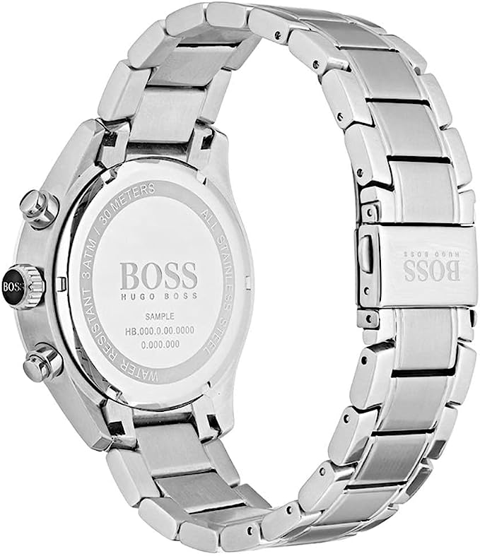 Мужские часы Hugo Boss Grand Prix HB1513478 представлены в 44-мм корпусе из нержавеющей стали с серебристым покрытием. Модель оснащена кварцевым механизмом с функцией хронографаХронографФункция позволяет измерять отрезки времени с особой точностью: часы, минуты, секунды. Верным признаком хронографа является наличие на циферблате 3 дополнительных окошек-счётчиков., тахиметраТахиметрРазмеченная шкала, располагается на ободке или безеле часов. Тахиметр позволяет рассчитать скорость на определённом участке пути, расстояние измеряется в километрах или милях. и секундомераСекундомерСекундоме́р — прибор, способный измерять интервалы времени с точностью до долей секунды., а также окошком даты на позиции 3 часа. Синий циферблат со штриховыми метками защищен устойчивым к царапинам минеральным стекломМинеральное стеклоМинеральное стекло представляет собой искусственно выращенный минерал кварца. Такое стекло отличается особой устойчивостью к повреждениям и царапинам. Уступает по некоторым качествам сапфировому стеклу.. Стальной браслет из нержавеющей стали дополнен раскладной застёжкойРаскладная застёжкаТакой тип застёжки используется только на браслетах из металла. Она никогда не раскрывается полностью, происходит разделение на 2 и более частей. Раскладывающая застёжка снизит вероятность потери часов к минимуму.. Водонепроницаемость WR30 (3 ATM) обеспечивает защиту от брызг воды и дождя.