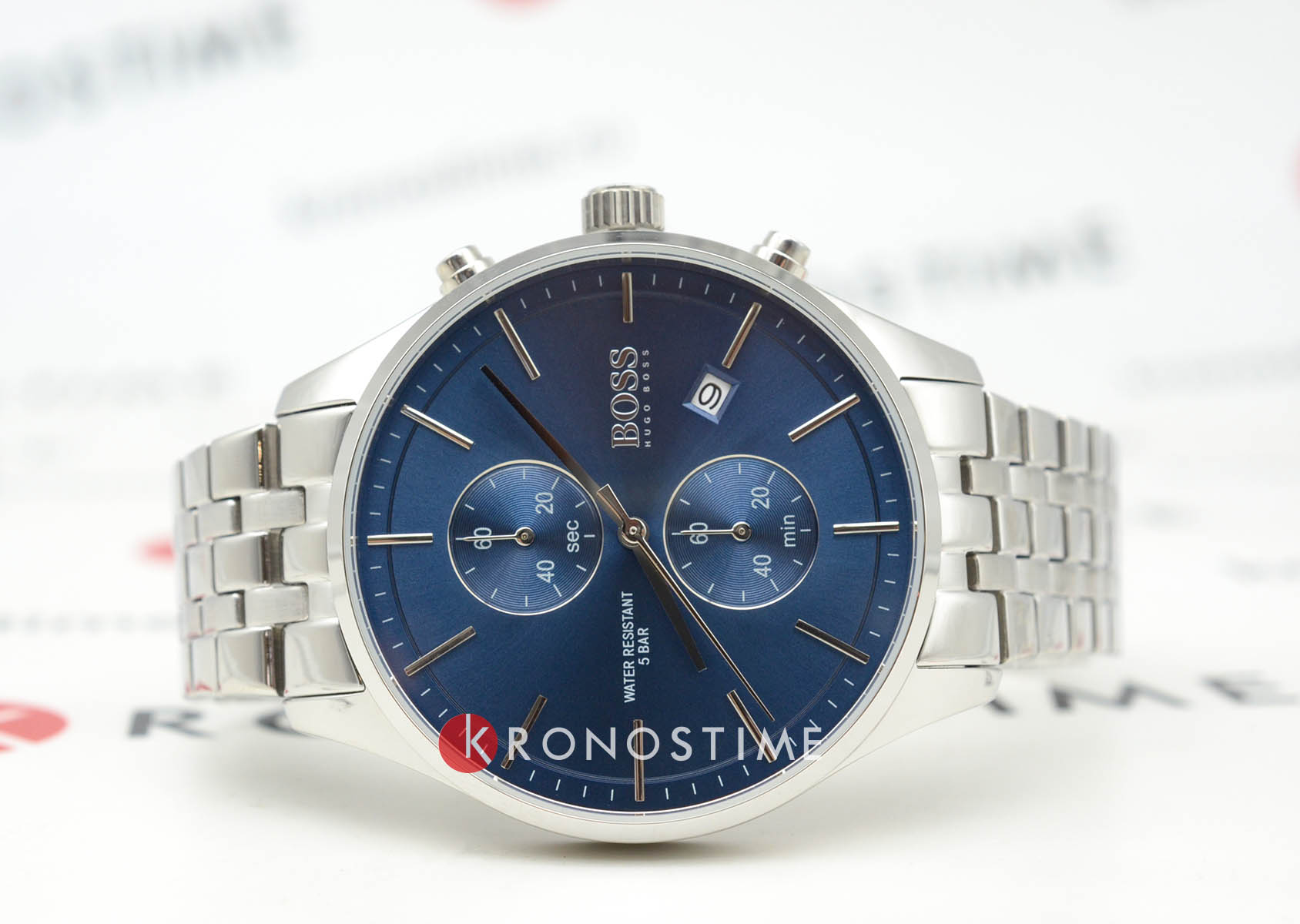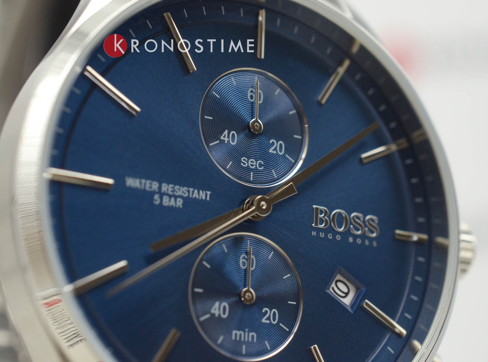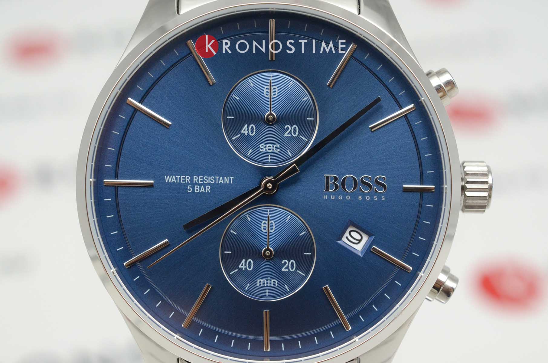 Мужские часы Hugo Boss Associate HB1513839 представлены в круглом 42-мм корпусе из нержавеющей стали 316L, оснащены кварцевым механизмом с функцией хронографаХронографФункция позволяет измерять отрезки времени с особой точностью: часы, минуты, секунды. Верным признаком хронографа является наличие на циферблате 3 дополнительных окошек-счётчиков. и секундомеромСекундомерСекундоме́р — прибор, способный измерять интервалы времени с точностью до долей секунды., а также окошком даты на позиции 4 часа. Синий циферблат со штриховыми метками и люминесцентными стрелками защищен устойчивым к царапинам минеральным стекломМинеральное стеклоМинеральное стекло представляет собой искусственно выращенный минерал кварца. Такое стекло отличается особой устойчивостью к повреждениям и царапинам. Уступает по некоторым качествам сапфировому стеклу., а стальной браслет дополнен раскладной застёжкойРаскладная застёжкаТакой тип застёжки используется только на браслетах из металла. Она никогда не раскрывается полностью, происходит разделение на 2 и более частей. Раскладывающая застёжка снизит вероятность потери часов к минимуму. для удобной регулировки. Водонепроницаемость 50 метров (5 ATM) обеспечивает защиту от брызг воды и дождя.