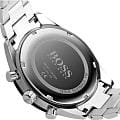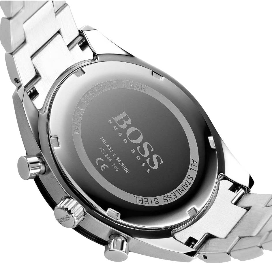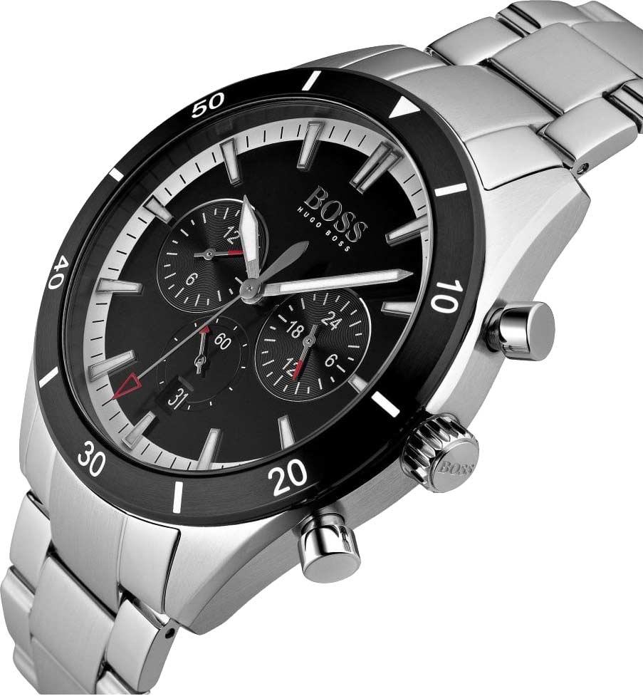 Мужские часы Hugo Boss HB1513862 коллекции Santiago представлены в круглом 44-мм корпусе из нержавеющей стали 316L с IP-покрытиемIP-покрытиеМетод ионного напыления. Демонстрирует повышенную устойчивость к истиранию, окислению и химическим веществам. Под воздействием высокого давления и температуры около 1500°C молекулы металла надёжно соединяются с частицами корпуса часов.. Оснащены кварцевым механизмом с функциями хронографаХронографФункция позволяет измерять отрезки времени с особой точностью: часы, минуты, секунды. Верным признаком хронографа является наличие на циферблате 3 дополнительных окошек-счётчиков., секундомеромСекундомерСекундоме́р — прибор, способный измерять интервалы времени с точностью до долей секунды. и тахиметрической шкалойТахиметрРазмеченная шкала, располагается на ободке или безеле часов. Тахиметр позволяет рассчитать скорость на определённом участке пути, расстояние измеряется в километрах или милях., а также индикацией даты. Черный циферблат с метками в виде штрихов защищен устойчивым к царапинам минеральным стекломМинеральное стеклоМинеральное стекло представляет собой искусственно выращенный минерал кварца. Такое стекло отличается особой устойчивостью к повреждениям и царапинам. Уступает по некоторым качествам сапфировому стеклу.. Браслет из стали 316L дополнен раскладной застёжкойРаскладная застёжкаТакой тип застёжки используется только на браслетах из металла. Она никогда не раскрывается полностью, происходит разделение на 2 и более частей. Раскладывающая застёжка снизит вероятность потери часов к минимуму.. Водонепроницаемость 50 метров (5 ATM) обеспечивает защиту от брызг и дождя.