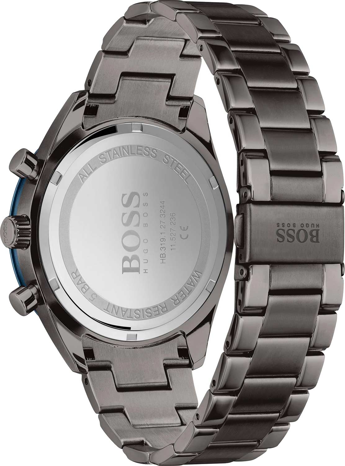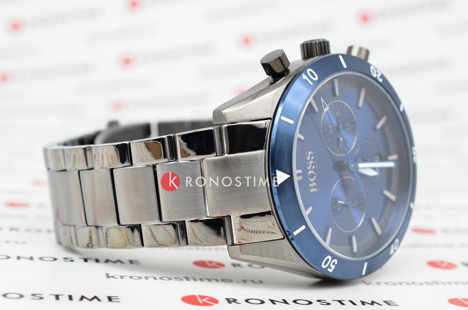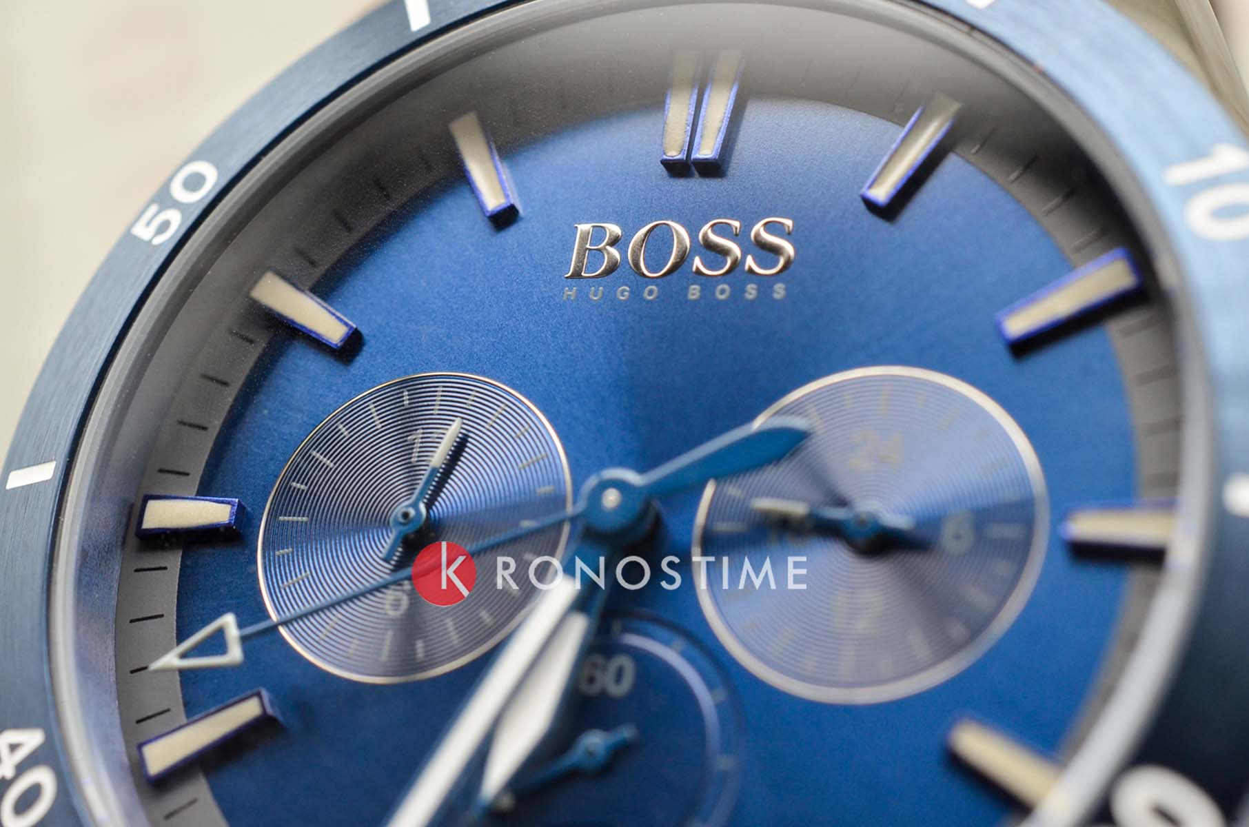 Мужские часы Hugo Boss HB1513863 коллекции Santiago представлены в круглом 44-мм корпусе из нержавеющей стали 316L с  IP-покрытиемIP-покрытиеМетод ионного напыления. Демонстрирует повышенную устойчивость к истиранию, окислению и химическим веществам. Под воздействием высокого давления и температуры около 1500°C молекулы металла надёжно соединяются с частицами корпуса часов.. Оснащены кварцевым механизмом с функциями хронографаХронографФункция позволяет измерять отрезки времени с особой точностью: часы, минуты, секунды. Верным признаком хронографа является наличие на циферблате 3 дополнительных окошек-счётчиков., секундомеромСекундомерСекундоме́р — прибор, способный измерять интервалы времени с точностью до долей секунды. и тахиметрической шкалойТахиметрРазмеченная шкала, располагается на ободке или безеле часов. Тахиметр позволяет рассчитать скорость на определённом участке пути, расстояние измеряется в километрах или милях., а также индикацией даты. Синий циферблат с метками в виде штрихов защищен устойчивым к царапинам минеральным стекломМинеральное стеклоМинеральное стекло представляет собой искусственно выращенный минерал кварца. Такое стекло отличается особой устойчивостью к повреждениям и царапинам. Уступает по некоторым качествам сапфировому стеклу.. Стальной браслет с IP-покрытиемIP-покрытиеМетод ионного напыления. Демонстрирует повышенную устойчивость к истиранию, окислению и химическим веществам. Под воздействием высокого давления и температуры около 1500°C молекулы металла надёжно соединяются с частицами корпуса часов. дополнен раскладной застёжкойРаскладная застёжкаТакой тип застёжки используется только на браслетах из металла. Она никогда не раскрывается полностью, происходит разделение на 2 и более частей. Раскладывающая застёжка снизит вероятность потери часов к минимуму.. Водонепроницаемость 50 метров (5 ATM) обеспечивает защиту от брызг и дождя.