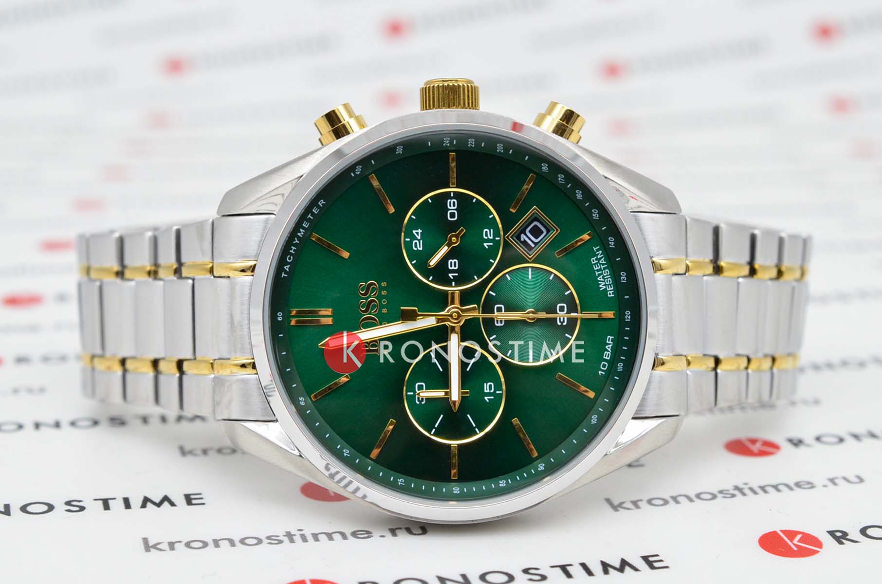 Мужские часы Hugo Boss Champion HB1513878 представлены в круглом 44-мм корпусе из нержавеющей стали. Изысканные часы оснащены кварцевым механизмом с функциями хронографаХронографФункция позволяет измерять отрезки времени с особой точностью: часы, минуты, секунды. Верным признаком хронографа является наличие на циферблате 3 дополнительных окошек-счётчиков., тахиметраТахиметрРазмеченная шкала, располагается на ободке или безеле часов. Тахиметр позволяет рассчитать скорость на определённом участке пути, расстояние измеряется в километрах или милях. и секундомераСекундомерСекундоме́р — прибор, способный измерять интервалы времени с точностью до долей секунды., а также индикацией даты. Эффектный зеленый циферблат с метками в виде штрихов защищен устойчивым к царапинам минеральным стекломМинеральное стеклоМинеральное стекло представляет собой искусственно выращенный минерал кварца. Такое стекло отличается особой устойчивостью к повреждениям и царапинам. Уступает по некоторым качествам сапфировому стеклу.. Браслет из стали серебристого цвета c PVD-покрытиемPVDУльтратонкое покрытие наносится в технике вакуумного напыления, сочетает в себе нитрид титана особой прочности со слоем золота или оксида хрома. Несёт в себе декоративную или защитную функцию. дополнен раскладной застёжкойРаскладная застёжкаТакой тип застёжки используется только на браслетах из металла. Она никогда не раскрывается полностью, происходит разделение на 2 и более частей. Раскладывающая застёжка снизит вероятность потери часов к минимуму.. Водонепроницаемость 100 метров (10 ATM) обеспечивает защиту от брызг и дождя. Hugo Boss Champion HB1513878 — это не просто часы, а настоящее произведение часового искусства, способное подчеркнуть вашу индивидуальность и статус.