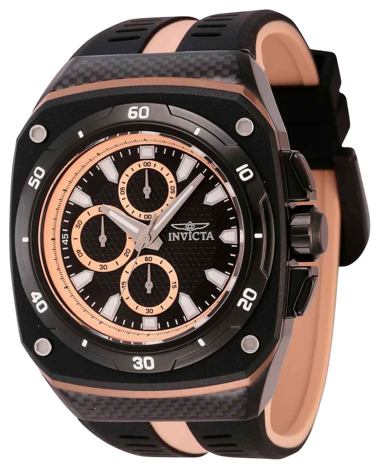 Мужские наручные часы-хронографХронографФункция позволяет измерять отрезки времени с особой точностью: часы, минуты, секунды. Верным признаком хронографа является наличие на циферблате 3 дополнительных окошек-счётчиков. Invicta IN46105 из коллекции Speedway сочетают в себе спортивный дизайн и надежность современных технологий. Модель обладает круглым корпусом диаметром 46 мм, изготовленным из стали с IP-покрытиемIP-покрытиеМетод ионного напыления. Демонстрирует повышенную устойчивость к истиранию, окислению и химическим веществам. Под воздействием высокого давления и температуры около 1500°C молекулы металла надёжно соединяются с частицами корпуса часов., что обеспечивает привлекательный внешний вид и устойчивость к коррозии . Ремешок выполнен из силикона шириной 3 см, гарантируя комфортное ношение . Черный циферблат с метками в виде штрихов оснащен люминесцентным покрытиемЛюминесцентное покрытиеПозволяет считывать показания времени в темноте. Производители наносят на стрелки, часовые индексы, безель или поверхность циферблата светонакопительный состав, дающий холодное свечение., что обеспечивает хорошую видимость в темноте . Для защиты используется минеральное стеклоМинеральное стеклоМинеральное стекло представляет собой искусственно выращенный минерал кварца. Такое стекло отличается особой устойчивостью к повреждениям и царапинам. Уступает по некоторым качествам сапфировому стеклу., обеспечивающее прочную защиту от царапин . Часы работают на кварцевом механизме, что гарантирует точное время без необходимости подзаводки. Модель также является хронографомХронографФункция позволяет измерять отрезки времени с особой точностью: часы, минуты, секунды. Верным признаком хронографа является наличие на циферблате 3 дополнительных окошек-счётчиков., оснащенным функцией секундомераСекундомерСекундоме́р — прибор, способный измерять интервалы времени с точностью до долей секунды., делая ее идеальной для активного образа жизни . Водонепроницаемость часов достигает 50 метров (5 атмосфер), что позволяет использовать их во время мытья рук или дождя, однако не рекомендуется для плавания или дайвинга .