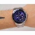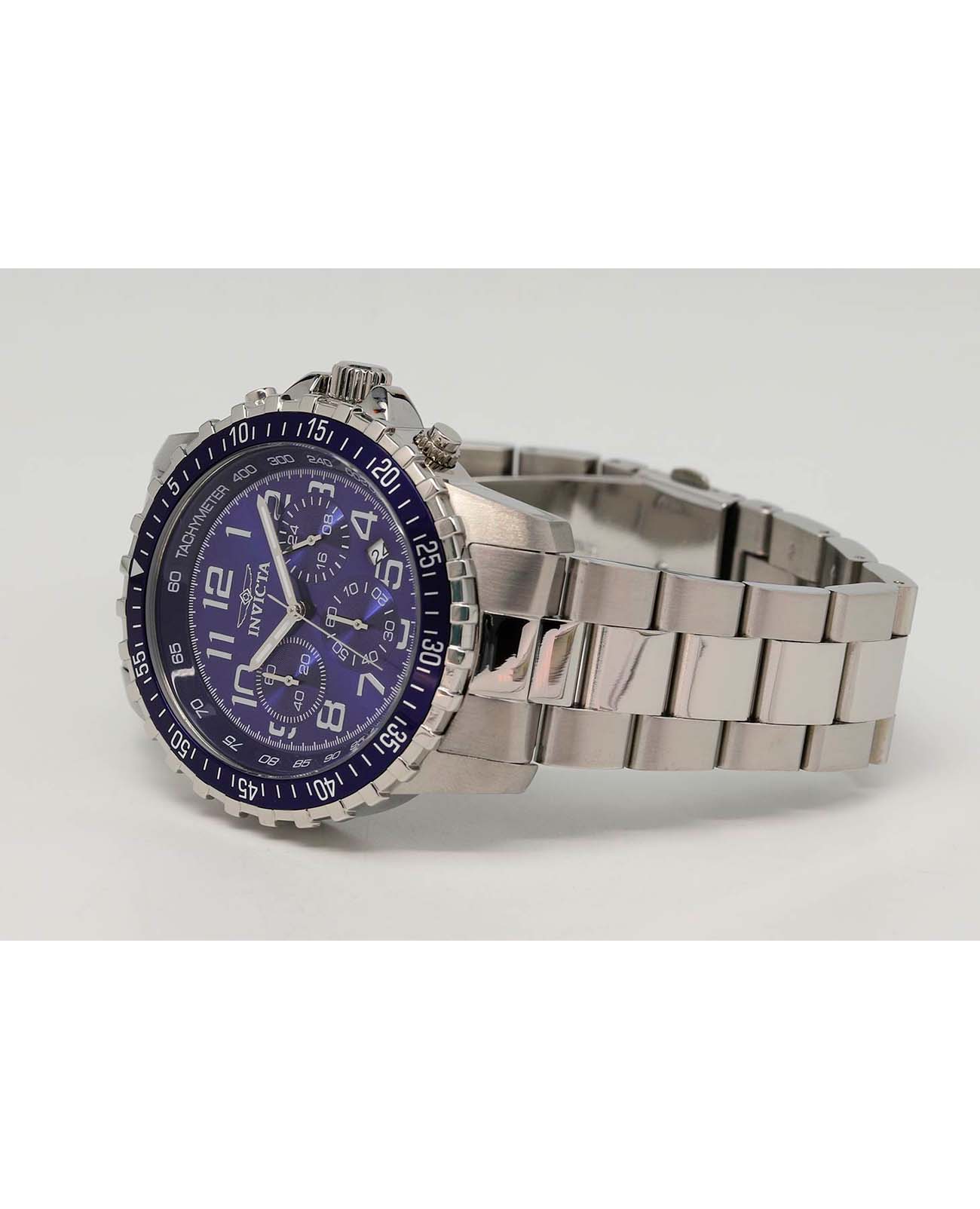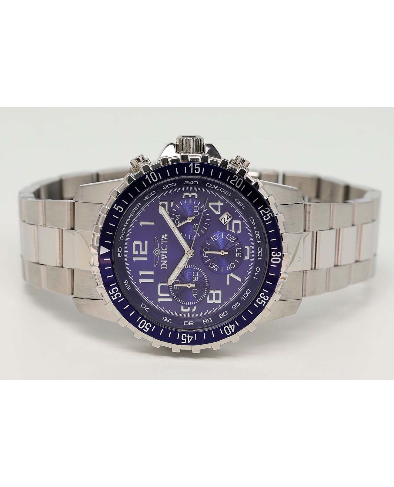 Мужские наручные часы-хронографХронографФункция позволяет измерять отрезки времени с особой точностью: часы, минуты, секунды. Верным признаком хронографа является наличие на циферблате 3 дополнительных окошек-счётчиков. Invicta Specialty IN6621 из коллекции Specialty сочетают в себе спортивный дизайн и надежность современных технологий . Модель обладает круглым корпусом диаметром 45 мм, изготовленным из нержавеющей стали, что обеспечивает высокую устойчивость к внешним воздействиям . БезельБезельВнешний ободок, закрепляющий стекло. В спортивных часах так называется поворотное кольцо с делениями на циферблате, выполняет роль таймера – замеряет отрезки времени на шкале. Неподвижный безель – элемент декора. Однонаправленно вращающийся безель на дайверских часах позволяет фиксировать моменты погружения и выныривания на поверхность. с IP-покрытиемIP-покрытиеМетод ионного напыления. Демонстрирует повышенную устойчивость к истиранию, окислению и химическим веществам. Под воздействием высокого давления и температуры около 1500°C молекулы металла надёжно соединяются с частицами корпуса часов. выполнен с рифленой отделкой, придающей часам дополнительную элегантность . Браслет также выполнен из нержавеющей стали с раскладывающейся застежкойРаскладная застёжкаТакой тип застёжки используется только на браслетах из металла. Она никогда не раскрывается полностью, происходит разделение на 2 и более частей. Раскладывающая застёжка снизит вероятность потери часов к минимуму., гарантирующей комфортное ношение и безопасность . Синий циферблат дополнен метками в виде штрихов и светящимися стрелками с люминесцентным покрытиемЛюминесцентное покрытиеПозволяет считывать показания времени в темноте. Производители наносят на стрелки, часовые индексы, безель или поверхность циферблата светонакопительный состав, дающий холодное свечение., которые обеспечивают отличную видимость даже в темное время суток . Для защиты используется минеральное стеклоМинеральное стеклоМинеральное стекло представляет собой искусственно выращенный минерал кварца. Такое стекло отличается особой устойчивостью к повреждениям и царапинам. Уступает по некоторым качествам сапфировому стеклу., оснащенное антибликовым покрытием, что делает его устойчивым к царапинам и бликам . Часы оснащены кварцевым механизмом, что гарантирует точность хода без необходимости подзаводки .  Модель также является хронографомХронографФункция позволяет измерять отрезки времени с особой точностью: часы, минуты, секунды. Верным признаком хронографа является наличие на циферблате 3 дополнительных окошек-счётчиков., оснащенным функцией секундомераСекундомерСекундоме́р — прибор, способный измерять интервалы времени с точностью до долей секунды., делая ее идеальной для активного образа жизни . Водонепроницаемость часов достигает 100 метров (10 атмосфер), что позволяет использовать их во время плавания и других водных видов спорта, однако не рекомендуется для глубоководного дайвинга . Сочетание практичности, надежности и стильного дизайна делает эту модель универсальным аксессуаром как для повседневной носки, так и для занятий спортом.