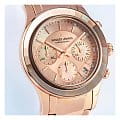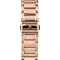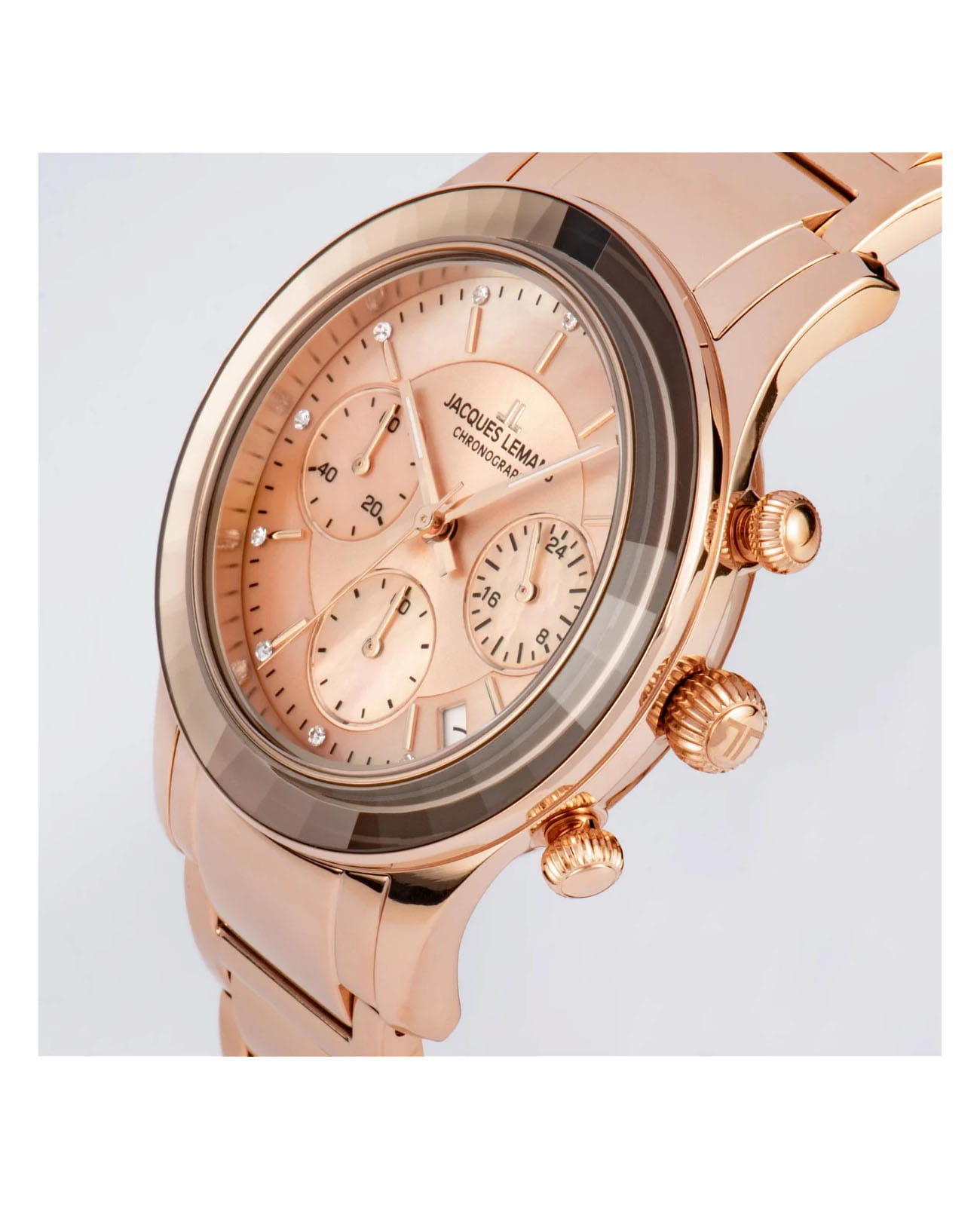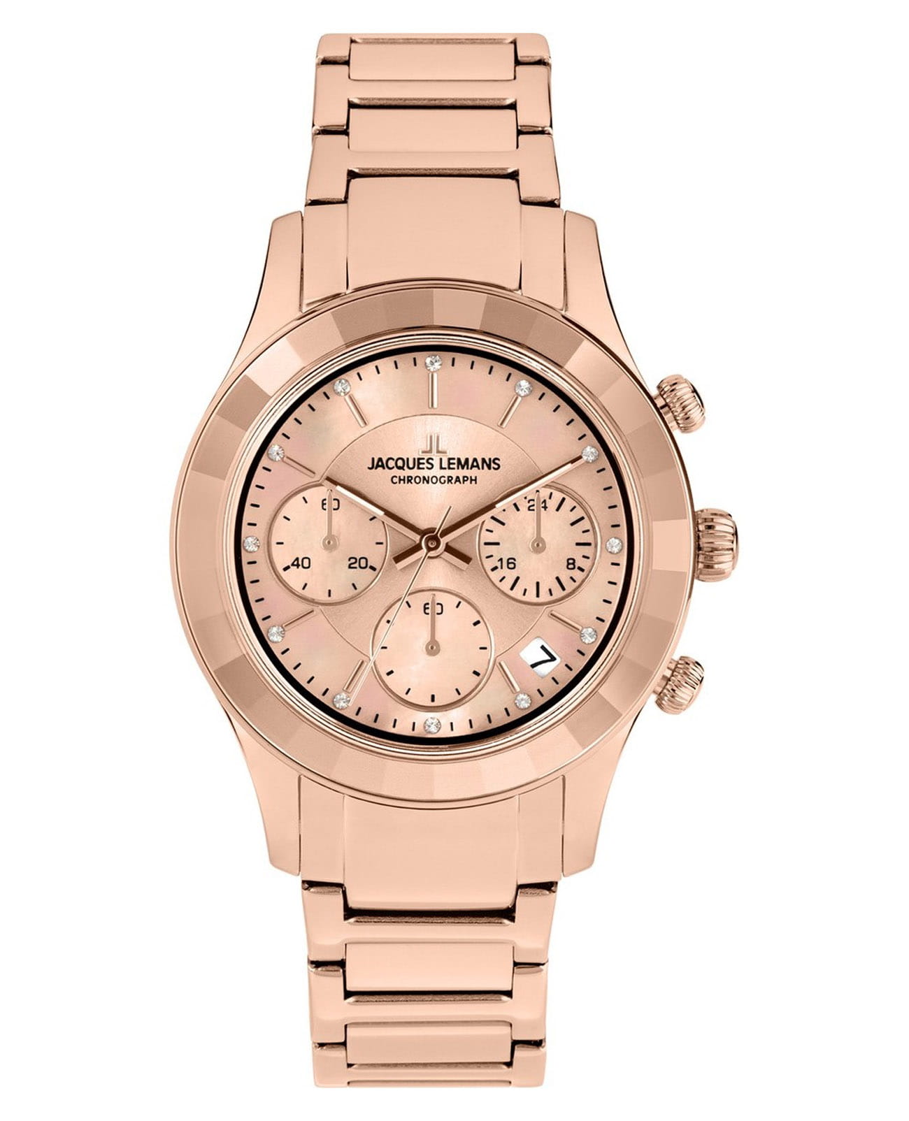 Женские часы-хронографХронографФункция позволяет измерять отрезки времени с особой точностью: часы, минуты, секунды. Верным признаком хронографа является наличие на циферблате 3 дополнительных окошек-счётчиков. c секундомеромСекундомерСекундоме́р — прибор, способный измерять интервалы времени с точностью до долей секунды. Jacques Lemans Venice 1-2151i, кварцевый механизм с высокой точностью. Минеральное стеклоМинеральное стеклоМинеральное стекло представляет собой искусственно выращенный минерал кварца. Такое стекло отличается особой устойчивостью к повреждениям и царапинам. Уступает по некоторым качествам сапфировому стеклу. устойчивое к мелким механическим повреждениям. Корпус из нержавеющей стали с PVDPVDУльтратонкое покрытие наносится в технике вакуумного напыления, сочетает в себе нитрид титана особой прочности со слоем золота или оксида хрома. Несёт в себе декоративную или защитную функцию. покрытием. Широкий безельБезельВнешний ободок, закрепляющий стекло. В спортивных часах так называется поворотное кольцо с делениями на циферблате, выполняет роль таймера – замеряет отрезки времени на шкале. Неподвижный безель – элемент декора. Однонаправленно вращающийся безель на дайверских часах позволяет фиксировать моменты погружения и выныривания на поверхность. с гранями. На циферблате расположены три дополнительных индикатора. Окошко даты находится в положении между 4 и 5 часов. Стрелки с люминесцентным покрытиемЛюминесцентное покрытиеПозволяет считывать показания времени в темноте. Производители наносят на стрелки, часовые индексы, безель или поверхность циферблата светонакопительный состав, дающий холодное свечение.. Каждая накладная риска украшена кристаллом Swarowski. Класс водозащиты: 50 метров, позволит защитить корпус от случайных брызг или капель дождя. Браслет из нержавеющей стали с PVDPVDУльтратонкое покрытие наносится в технике вакуумного напыления, сочетает в себе нитрид титана особой прочности со слоем золота или оксида хрома. Несёт в себе декоративную или защитную функцию. покрытием на раскладной застёжкеРаскладная застёжкаТакой тип застёжки используется только на браслетах из металла. Она никогда не раскрывается полностью, происходит разделение на 2 и более частей. Раскладывающая застёжка снизит вероятность потери часов к минимуму..