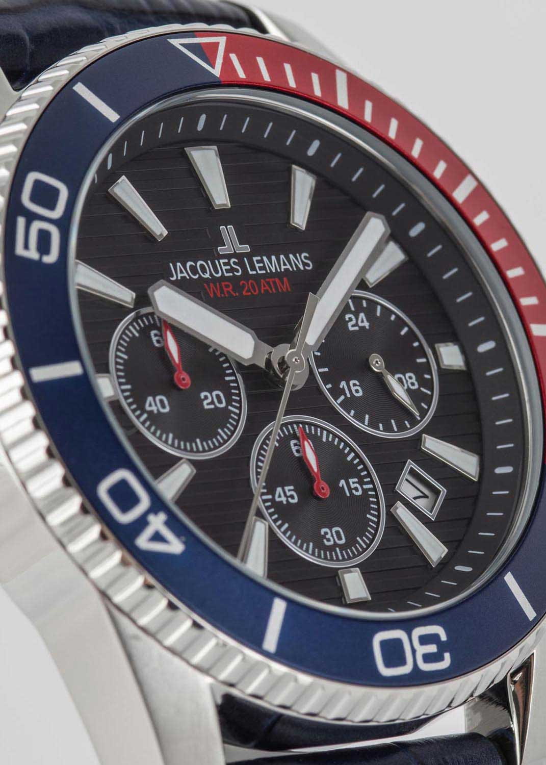 Мужские кварцевые часы-хронографХронографФункция позволяет измерять отрезки времени с особой точностью: часы, минуты, секунды. Верным признаком хронографа является наличие на циферблате 3 дополнительных окошек-счётчиков. с секундомеромСекундомерСекундоме́р — прибор, способный измерять интервалы времени с точностью до долей секунды. Jacques Lemans 1-2206D – лаконичная красота и изысканная элегантность. Оригинальная модель с классическим оформлением станет превосходным завершением образа, наделив его индивидуальным характером. Корпус выполнен из нержавеющей стали серебристого цвета, диаметром 44 мм, что обеспечивает долговечность и утончённый внешний вид. Минеральное стеклоМинеральное стеклоМинеральное стекло представляет собой искусственно выращенный минерал кварца. Такое стекло отличается особой устойчивостью к повреждениям и царапинам. Уступает по некоторым качествам сапфировому стеклу. повышенной прочности Crystex защищает циферблат от царапин. Поворотный безельБезельВнешний ободок, закрепляющий стекло. В спортивных часах так называется поворотное кольцо с делениями на циферблате, выполняет роль таймера – замеряет отрезки времени на шкале. Неподвижный безель – элемент декора. Однонаправленно вращающийся безель на дайверских часах позволяет фиксировать моменты погружения и выныривания на поверхность. с PVD-покрытиемPVDУльтратонкое покрытие наносится в технике вакуумного напыления, сочетает в себе нитрид титана особой прочности со слоем золота или оксида хрома. Несёт в себе декоративную или защитную функцию. сине-красного цвета. Ремешок состоит из двух частей: внутренняя сделана из силикона, внешняя — из натуральной кожи. Классическая застежка с логотипом бренда. Водозащита 200 метров позволит плавать, нырять и заниматься другими водными видами спорта. Стрелки и метки с люминесцентным покрытиемЛюминесцентное покрытиеПозволяет считывать показания времени в темноте. Производители наносят на стрелки, часовые индексы, безель или поверхность циферблата светонакопительный состав, дающий холодное свечение. позволяющие легко определять время даже в темноте. 12-ти и 24-х часовой формат времени. Окошко даты находится в положении между 4 и 5 часами. Рифленая заводная головка с защитой. Это аксессуар для мужчины, который ценит классический стиль и функциональность.