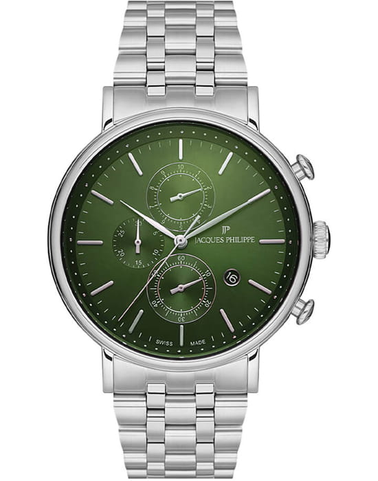 Швейцарские мужские часы-хронографХронографФункция позволяет измерять отрезки времени с особой точностью: часы, минуты, секунды. Верным признаком хронографа является наличие на циферблате 3 дополнительных окошек-счётчиков. Jacques Philippe Aviator JPQGC0213X6, кварцевый механизм с высокой точностью. Сапфировое стеклоСапфировое стеклоПрочный и надёжный материал из кристалла сапфира синтетического происхождения, характеризующийся особой твёрдостью и устойчивостью к царапинам и повреждениям. устойчивое к появлению царапин, обладающее высокой прозрачностью. Корпус часов изготовлен из нержавеющей стали 316L. На циферблате три дополнительных индикатора. Окошко даты находится в положении 4 часов. Класс водозащиты: 50 метров, позволит защитить корпус от случайных брызг или капель дождя. Стальной браслет на застёжке «бабочка» с кнопкамиЗастёжка "бабочка"Такой вид застёжки дополняется предохранителями, помогающими избежать случайного раскрытия браслета. Обладают изящным исполнением. .